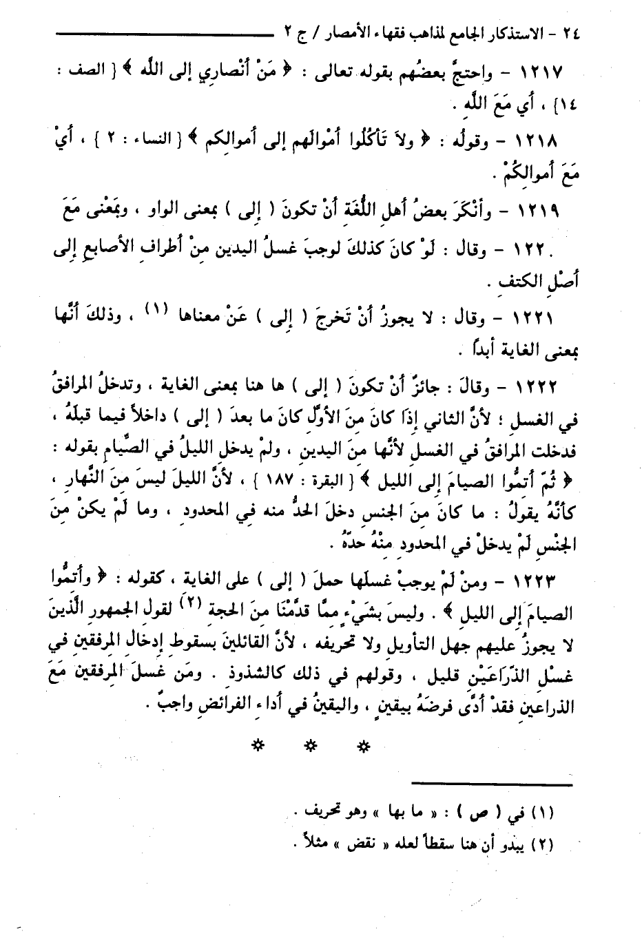 1223 - وَمَنْ لَمْ يُوجِبْ غَسْلَهَا حَمَلَ ( إِلَى ) عَلَى الْغَايَةِ، كَقَوْلِهِ: وَ "أَتِمُّوا الصِّيَامَ إِلَى اللَّيْلِ ". وَلَيْسَ بِشَيْءٍ مِمَّا قَدَّمْنَا مِنَ الْحُجَّةِ لِقَوْلِ الْجُمْهُورِ الَّذِينَ لَا يَجُوزُ عَلَيْهِمْ جَهْلُ التَّأْوِيلِ وَلَا تَحْرِيفُهُ، لِأَنَّ الْقَائِلِينَ بِسُقُوطِ إِدْخَالِ الْمِرْفَقَيْنِ فِي غَسْلِ الذِّرَاعَيْنِ قَلِيلٌ، وَقَوْلُهُمْ فِي ذَلِكَ كَالشُّذُوذِ. وَمَنْ غَسَلَ الْمِرْفَقَيْنِ مَعَ الذِّرَاعَيْنِ فَقَدْ أَدَّى فَرْضَهُ بِيَقِينٍ، وَالْيَقِينُ فِي أَدَاءِ الْفَرَائِضِ وَاجِبٌ.