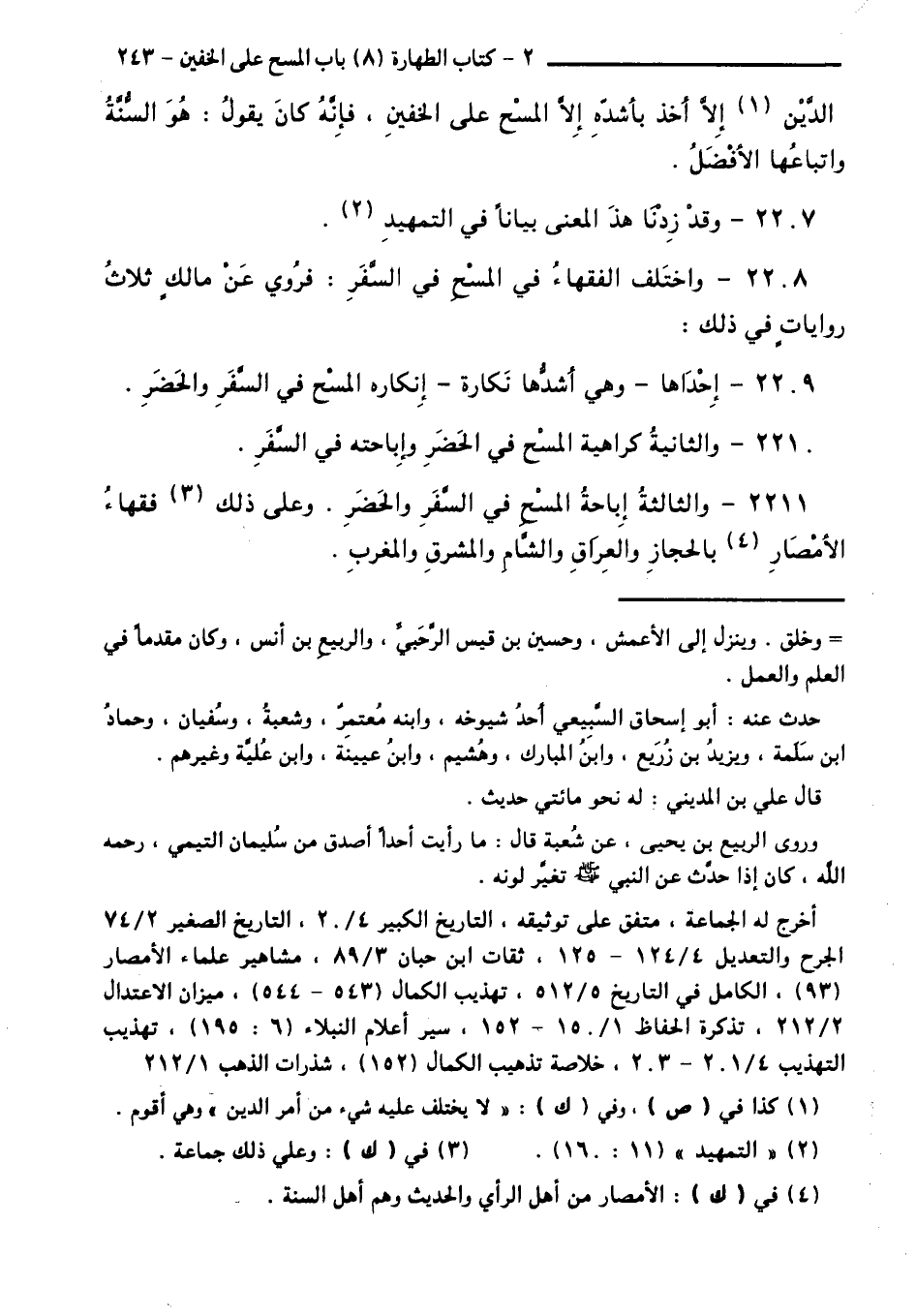 2211 - وَالثَّالِثَةُ إِبَاحَةُ الْمَسْحِ فِي السَّفَرِ وَالْحَضَرِ. وَعَلَى ذَلِكَ فُقَهَاءُ الْأَمْصَارِ بِالْحِجَازِ، وَالْعِرَاقِ، وَالشَّامِ، وَالْمَشْرِقِ، وَالْمَغْرِبِ.