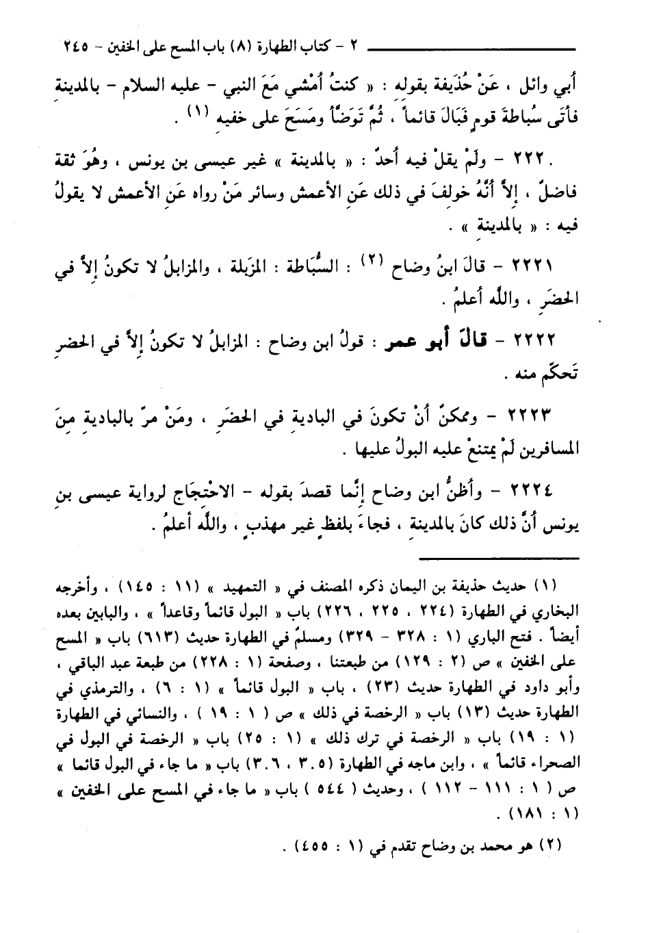أَبِي وَائِلٍ، عَنْ حُذَيْفَةَ بِقَوْلِهِ: "كُنْتُ أَمْشِي مَعَ النَّبِيِّ - عَلَيْهِ السَّلَامُ - بِالْمَدِينَةِ فَأَتَى سُبَاطَةَ قَوْمٍ فَبَالَ قَائِمًا، ثُمَّ تَوَضَّأَ وَمَسَحَ عَلَى خُفَّيْهِ.