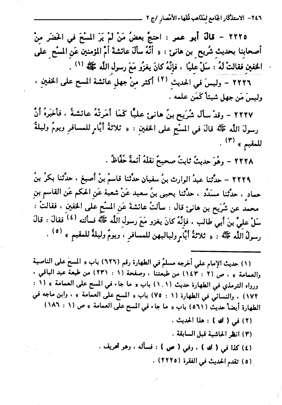 2225 - قَالَ أَبُو عُمَرَ: احْتَجَّ بَعْضُ مَنْ لَمْ يَرَ الْمَسْحَ فِي الْحَضَرِ مِنْ أَصْحَابِنَا بِحَدِيثِ شُرَيْحِ بْنِ هَانِئٍ: " أَنَّهُ سَأَلَ عَائِشَةَ أُمَّ الْمُؤْمِنِينَ عَنِ الْمَسْحِ عَلَى الْخُفَّيْنِ فَقَالَتْ: لَهُ سَلْ عَلِيًّا ؛ فَإِنَّهُ كَانَ يَغْزُو مَعَ رَسُولِ اللَّهِ - صَلَّى اللَّهُ عَلَيْهِ وَسَلَّمَ - ".