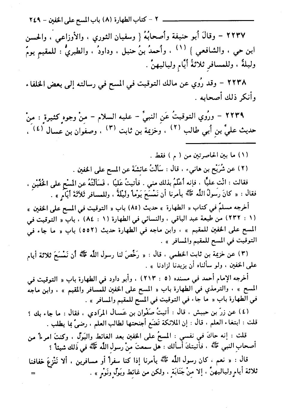 2239 - وَرُوِيَ التَّوْقِيتُ عَنِ النَّبِيِّ - عَلَيْهِ السَّلَامُ - مِنْ وُجُوهٍ كَثِيرَةٍ: مِنْ حَدِيثِ عَلِيِّ بْنِ أَبِي طَالِبٍ، وَخُزَيْمَةَ بْنِ ثَابِتٍ، وَصَفْوَانَ بْنِ عَسَّالٍ،