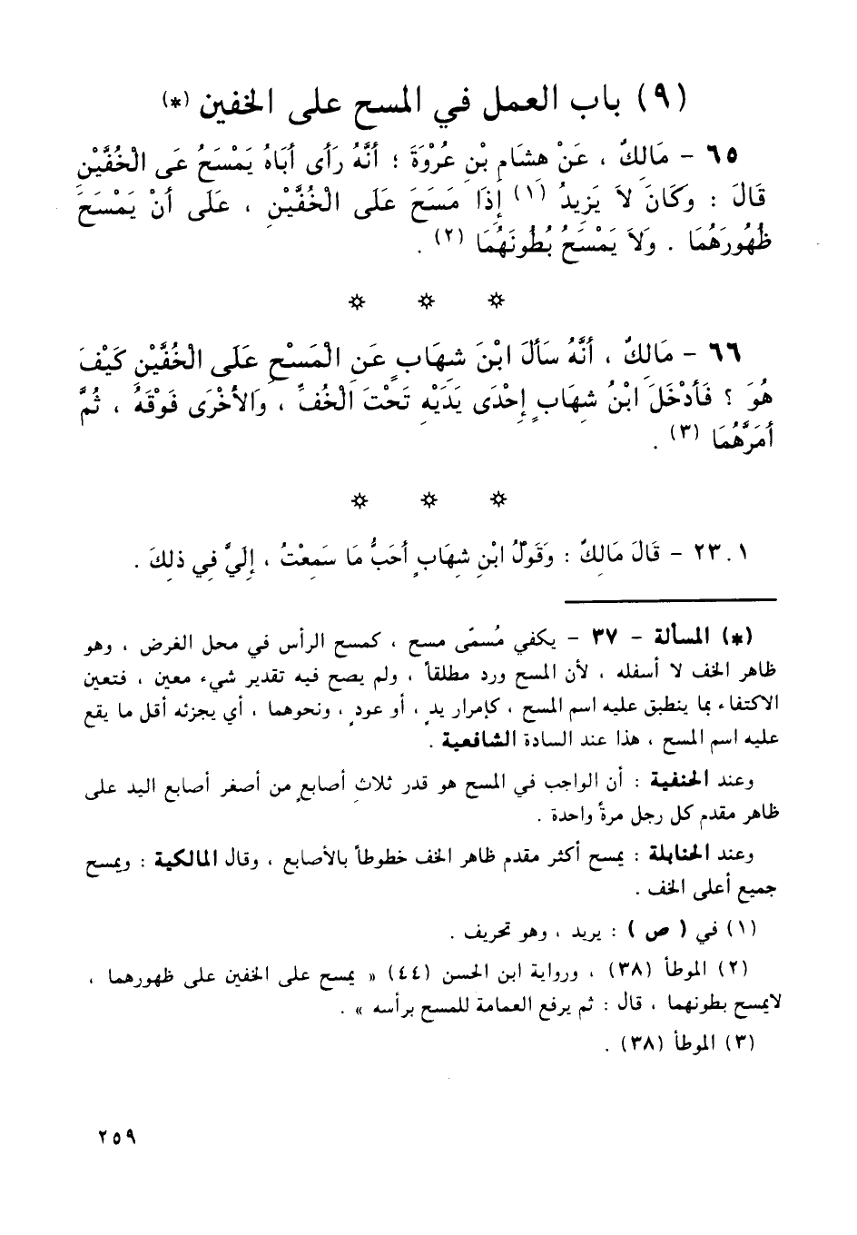 65 - مَالِكٌ، عَنْ هِشَامِ بْنِ عُرْوَةَ ؛ أَنَّهُ رَأَى أَبَاهُ يَمْسَحُ عَلَى الْخُفَّيْنِ قَالَ: وَكَانَ لَا يَزِيدُ إِذَا مَسَحَ عَلَى الْخُفَّيْنِ، عَلَى أَنْ يَمْسَحَ ظُهُورَهُمَا. وَلَا يَمْسَحُ بُطُونَهُمَا.