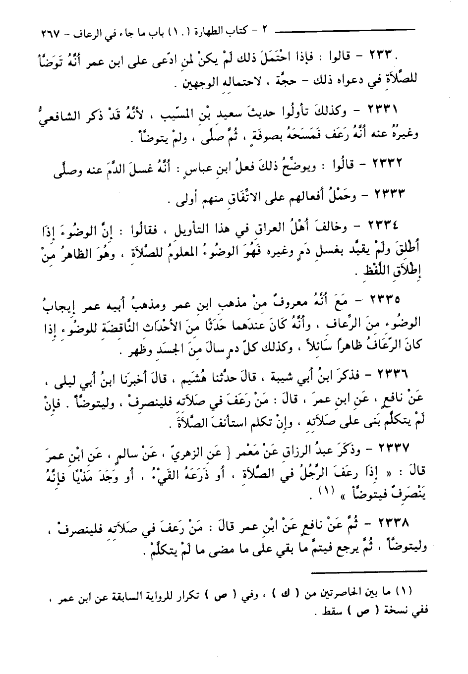 2335 - مَعَ أَنَّهُ مَعْرُوفٌ مِنْ مَذْهَبِ ابْنِ عُمَرَ وَمَذْهَبِ أَبِيهِ عُمَرَ إِيجَابُ الْوُضُوءِ مِنَ الرُّعَافِ، وَأَنَّهُ كَانَ عِنْدَهُمَا حَدَثًا مِنَ الْأَحْدَاثِ النَّاقِضَةِ لِلْوُضُوءِ إِذَا كَانَ الرُّعَافُ ظَاهِرًا سَائِلًا، وَكَذَلِكَ كُلُّ دَمٍ سَالَ مِنَ الْجَسَدِ وَظَهَرَ.