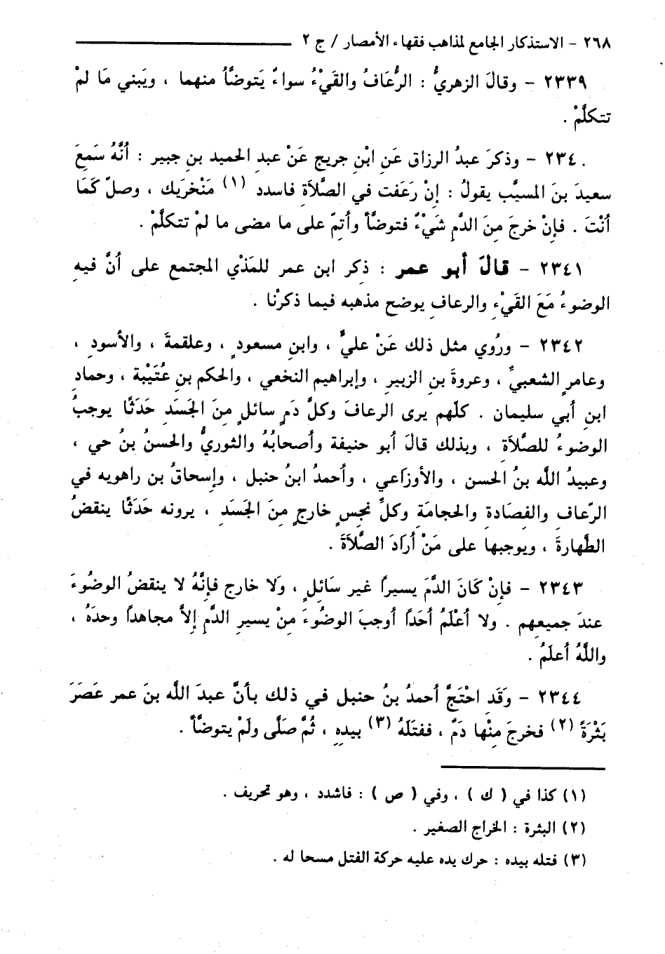 2342 - وَرُوِيَ مِثْلُ ذَلِكَ عَنْ عَلِيٍّ، وَابْنِ مَسْعُودٍ، وَعَلْقَمَةَ، وَالْأَسْوَدِ، وَعَامِرٍ الشَّعْبِيِّ، وَعُرْوَةَ بْنِ الزُّبَيْرِ، وَإِبْرَاهِيمَ النَّخَعِيِّ، وَالْحَكَمِ بْنِ عُتَيْبَةَ، وَحَمَّادِ بْنِ أَبِي سُلَيْمَانَ. كُلُّهُمْ يَرَى الرُّعَافَ وَكُلَّ دَمٍ سَائِلٍ مِنَ الْجَسَدِ حَدَثًا يُوجِبُ الْوُضُوءَ لِلصَّلَاةِ، وَبِذَلِكَ قَالَ أَبُو حَنِيفَةَ وَأَصْحَابُهُ وَالثَّوْرِيُّ وَالْحَسَنُ بْنُ حَيٍّ، وَعُبَيْدُ اللَّهِ بْنُ الْحَسَنِ، وَالْأَوْزَاعِيُّ، وَأَحْمَدُ بْنُ حَنْبَلٍ، وَإِسْحَاقُ بْنُ رَاهْوَيْهِ فِي الرُّعَافِ وَالْفَصَادَةِ وَالْحِجَامَةِ وَكُلِّ نَجِسٍ خَارِجٍ مِنَ الْجَسَدِ، يَرَوْنَهُ حَدَثًا يَنْقُضُ الطَّهَارَةَ، وَيُوجِبُهَا عَلَى مَنْ أَرَادَ الصَّلَاةَ.