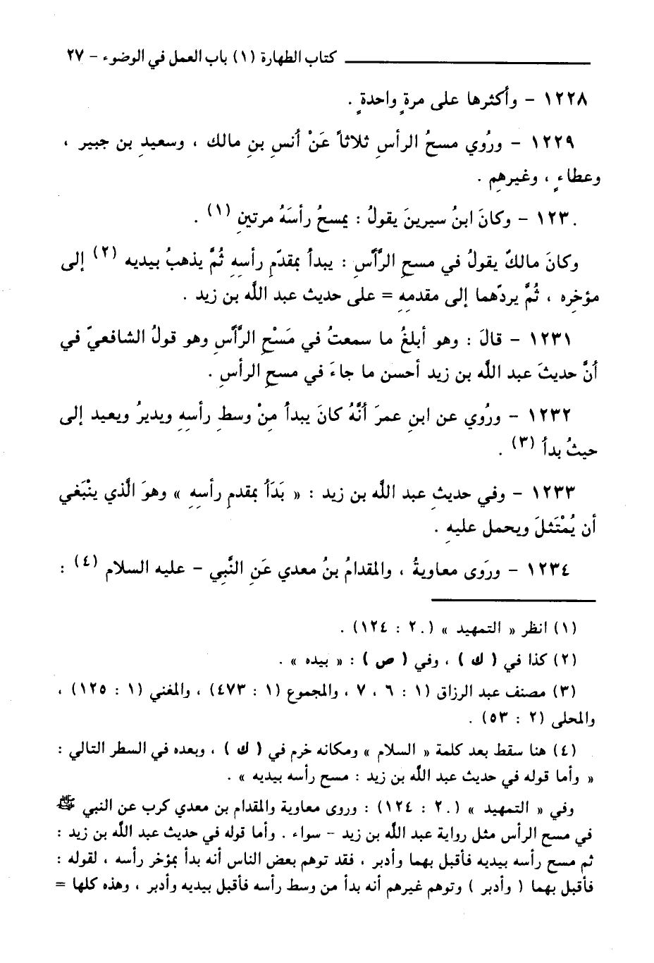 1230 - وَكَانَ ابْنُ سِيرِينَ يَقُولُ: يَمْسَحُ رَأْسَهُ مَرَّتَيْنِ. وَكَانَ مَالِكٌ يَقُولُ فِي مَسْحِ الرَّأْسِ: يَبْدَأُ بِمُقَدَّمِ رَأْسِهِ ثُمَّ يَذْهَبُ بِيَدَيْهِ إِلَى مُؤَخَّرِهِ، ثُمَّ يَرُدُّهُمَا إِلَى مُقَدَّمِهِ عَلَى حَدِيثِ عَبْدِ اللَّهِ بْنِ زَيْدٍ.