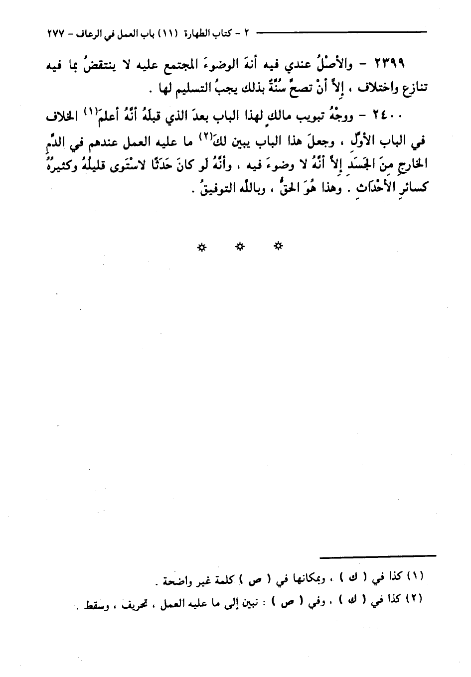 2400 - وَوَجْهُ تَبْوِيبِ مَالِكٍ لِهَذَا الْبَابِ بَعْدَ الَّذِي قَبْلَهُ أَنَّهُ أَعْلَمَ الْخِلَافَ فِي الْبَابِ الْأَوَّلِ، وَجَعَلَ هَذَا الْبَابَ يُبَيِّنُ لَكَ مَا عَلَيْهِ الْعَمَلُ عِنْدَهُمْ فِي الدَّمِ الْخَارِجِ مِنَ الْجَسَدِ إِلَّا أَنَّهُ لَا وُضُوءَ فِيهِ، وَأَنَّهُ لَوْ كَانَ حَدَثًا لَاسْتَوَى قَلِيلُهُ وَكَثِيرُهُ كَسَائِرِ الْأَحْدَاثِ. وَهَذَا هُوَ الْحَقُّ، وَبِاللَّهِ التَّوْفِيقُ.
