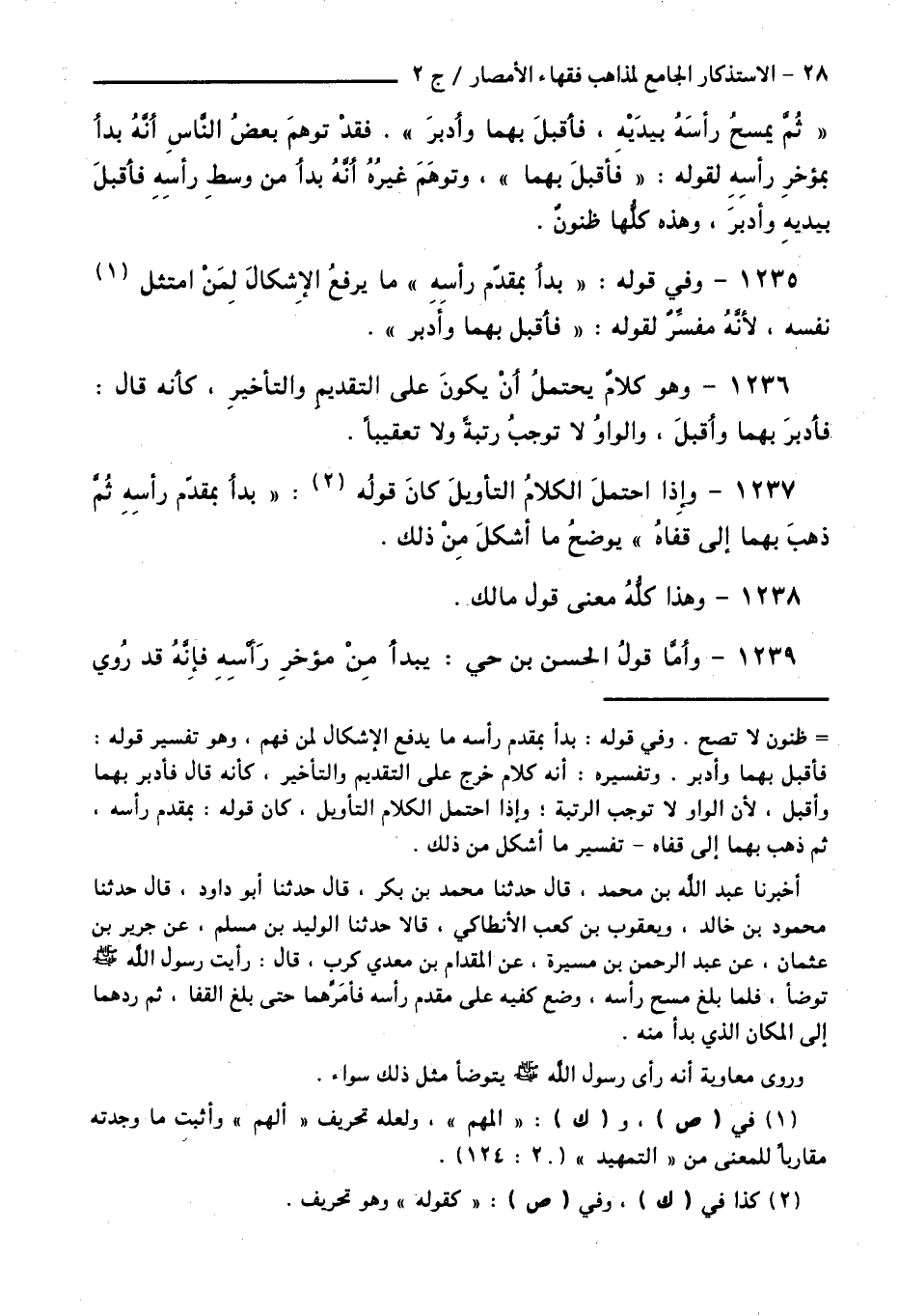 1237 - وَإِذَا احْتَمَلَ الْكَلَامُ التَّأْوِيلَ كَانَ قَوْلُهُ: " بَدَأَ بِمُقَدَّمِ رَأْسِهِ ثُمَّ ذَهَبَ بِهِمَا إِلَى قَفَاهُ " يُوَضِّحُ مَا أَشْكَلَ مِنْ ذَلِكَ.