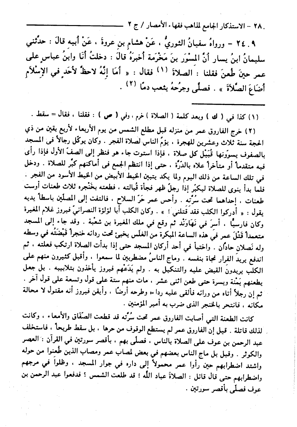 2409 - وَرَوَاهُ سُفْيَانُ الثَّوْرِيُّ، عَنْ هِشَامِ بْنِ عُرْوَةَ، عَنْ أَبِيهِ قَالَ: حَدَّثَنِي سُلَيْمَانُ بْنُ يَسَارٍ أَنَّ الْمِسْوَرَ بْنَ مَخْرَمَةَ أَخْبَرَهُ قَالَ: دَخَلْتُ أَنَا وَابْنُ عَبَّاسٍ عَلَى عُمَرَ حِينَ طُعِنَ فَقُلْنَا: الصَّلَاةُ فَقَالَ: " أَمَا إِنَّهُ لَا حَظَّ لِأَحَدٍ فِي الْإِسْلَامِ أَضَاعَ الصَّلَاةَ ". فَصَلَّى وَجُرْحُهُ يَثْعَبُ دَمًا.