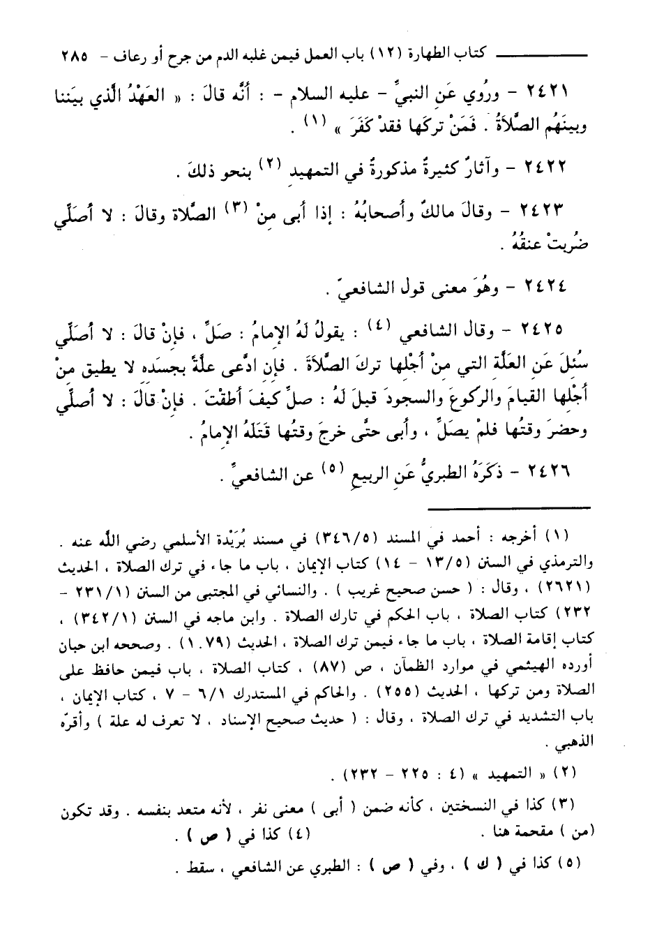 2421 - وَرُوِيَ عَنِ النَّبِيِّ - عَلَيْهِ السَّلَامُ -: أَنَّهُ قَالَ: "الْعَهْدُ الَّذِي بَيْنَنَا وَبَيْنَهُمُ الصَّلَاةُ. فَمَنْ تَرْكَهَا فَقَدْ كَفَرَ ".