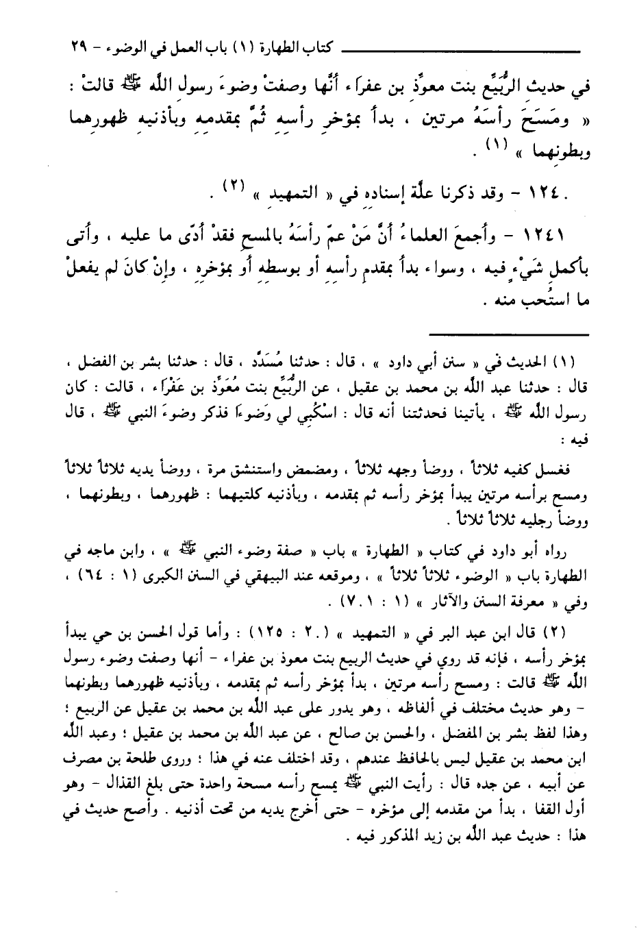 فِي حَدِيثِ الرُّبَيِّعِ بِنْتِ مُعَوِّذِ بْنِ عَفْرَاءَ أَنَّهَا وَصَفَتْ وُضُوءَ رَسُولِ اللَّهِ - صَلَّى اللَّهُ عَلَيْهِ وَسَلَّمَ - قَالَتْ: "وَمَسَحَ رَأْسَهُ مَرَّتَيْنِ، بَدَأَ بِمُؤَخَّرِ رَأْسِهِ ثُمَّ بِمُقَدَّمِهِ وَبِأُذُنَيْهِ ظُهُورِهِمَا وَبُطُونِهِمَا ".