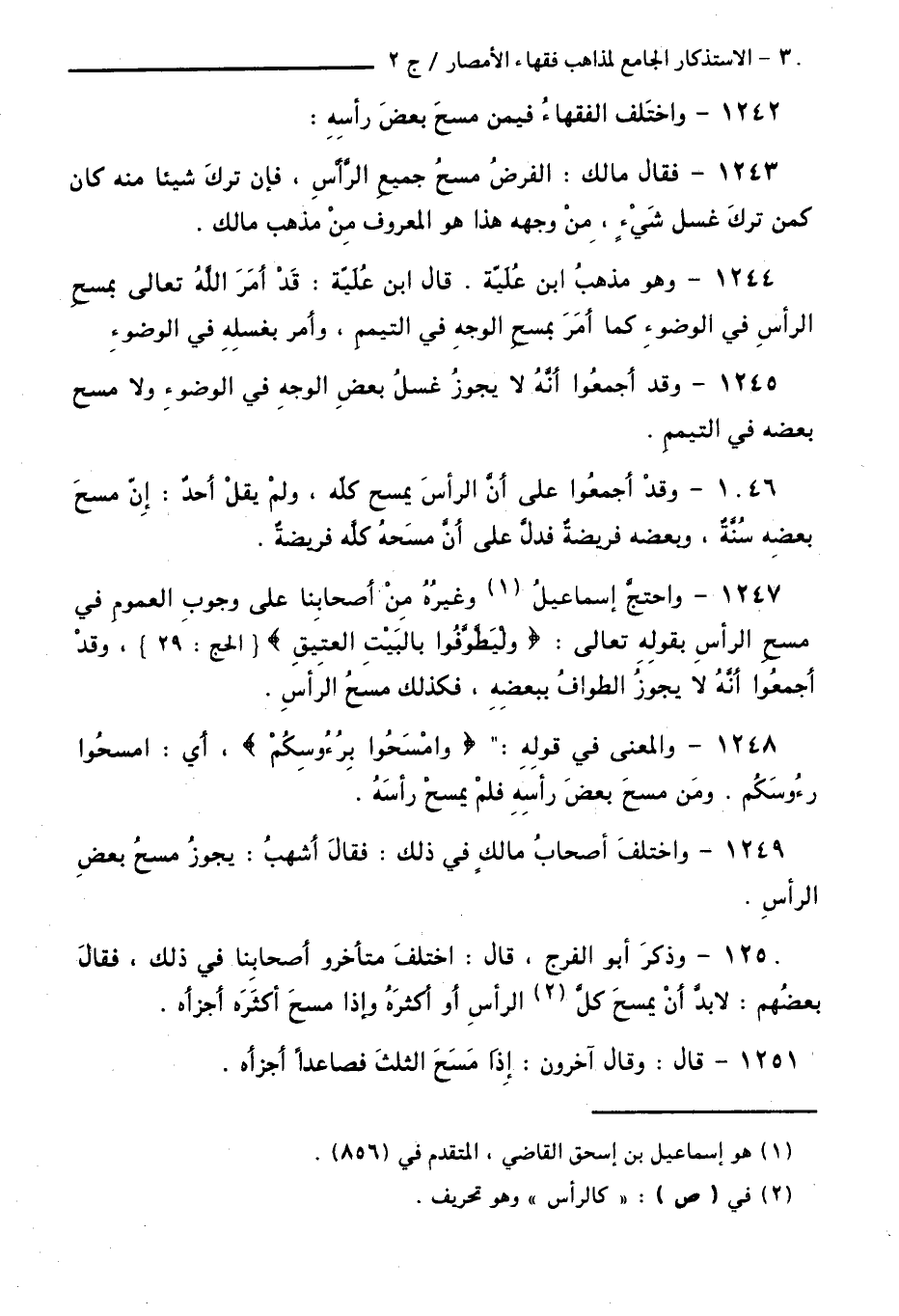 1244 - وَهُوَ مَذْهَبُ ابْنِ عُلَيَّةَ. قَالَ ابْنُ عُلَيَّةَ: قَدْ أَمَرَ اللَّهُ تَعَالَى بِمَسْحِ الرَّأْسِ فِي الْوُضُوءِ كَمَا أَمَرَ بِمَسْحِ الْوَجْهِ فِي التَّيَمُّمِ، وَأَمَرَ بِغَسْلِهِ فِي الْوُضُوءِ.