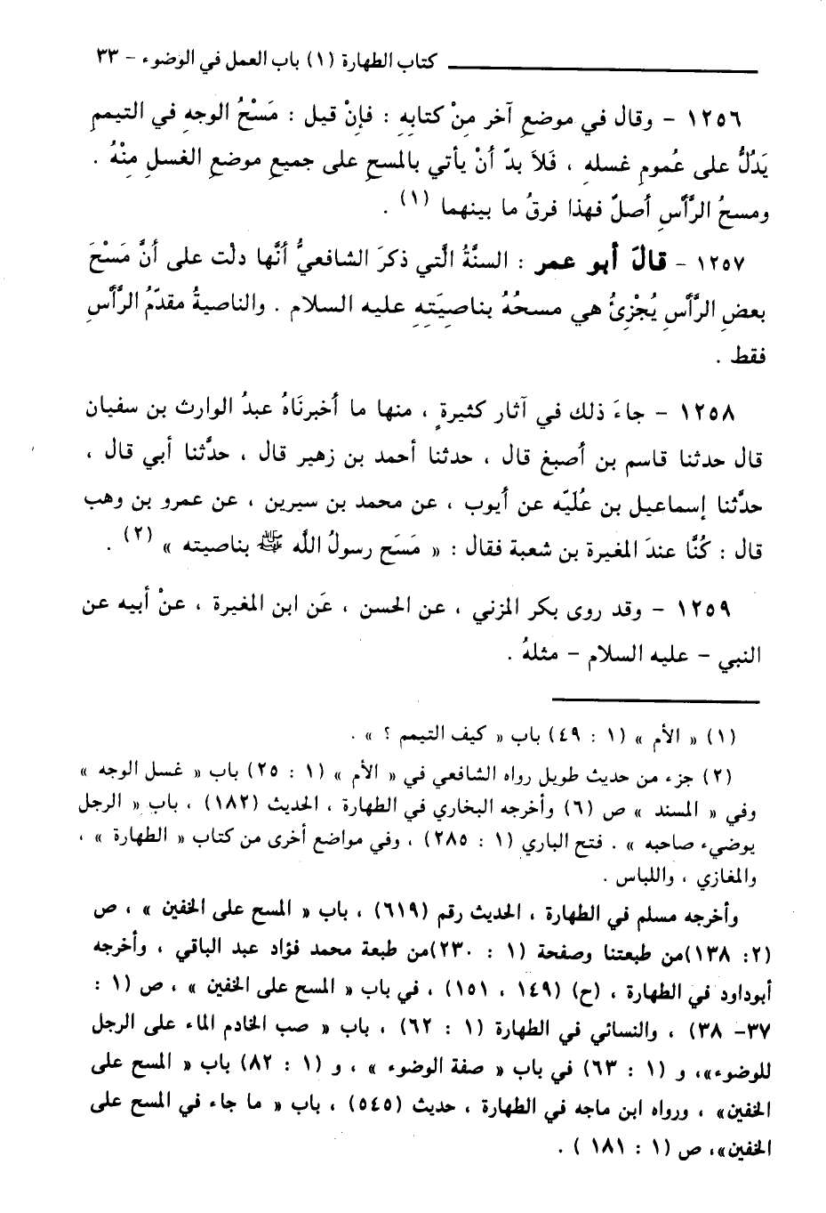 1257 - قَالَ أَبُو عُمَرَ: السُّنَّةُ الَّتِي ذَكَرَ الشَّافِعِيُّ أَنَّهَا دَلَّتْ عَلَى أَنَّ مَسْحَ بَعْضِ الرَّأْسِ يُجْزِئُ هِيَ مَسْحُهُ بِنَاصِيَتِهِ - عَلَيْهِ السَّلَامُ -. وَالنَّاصِيَةُ مُقَدَّمُ الرَّأْسِ فَقَطْ.
