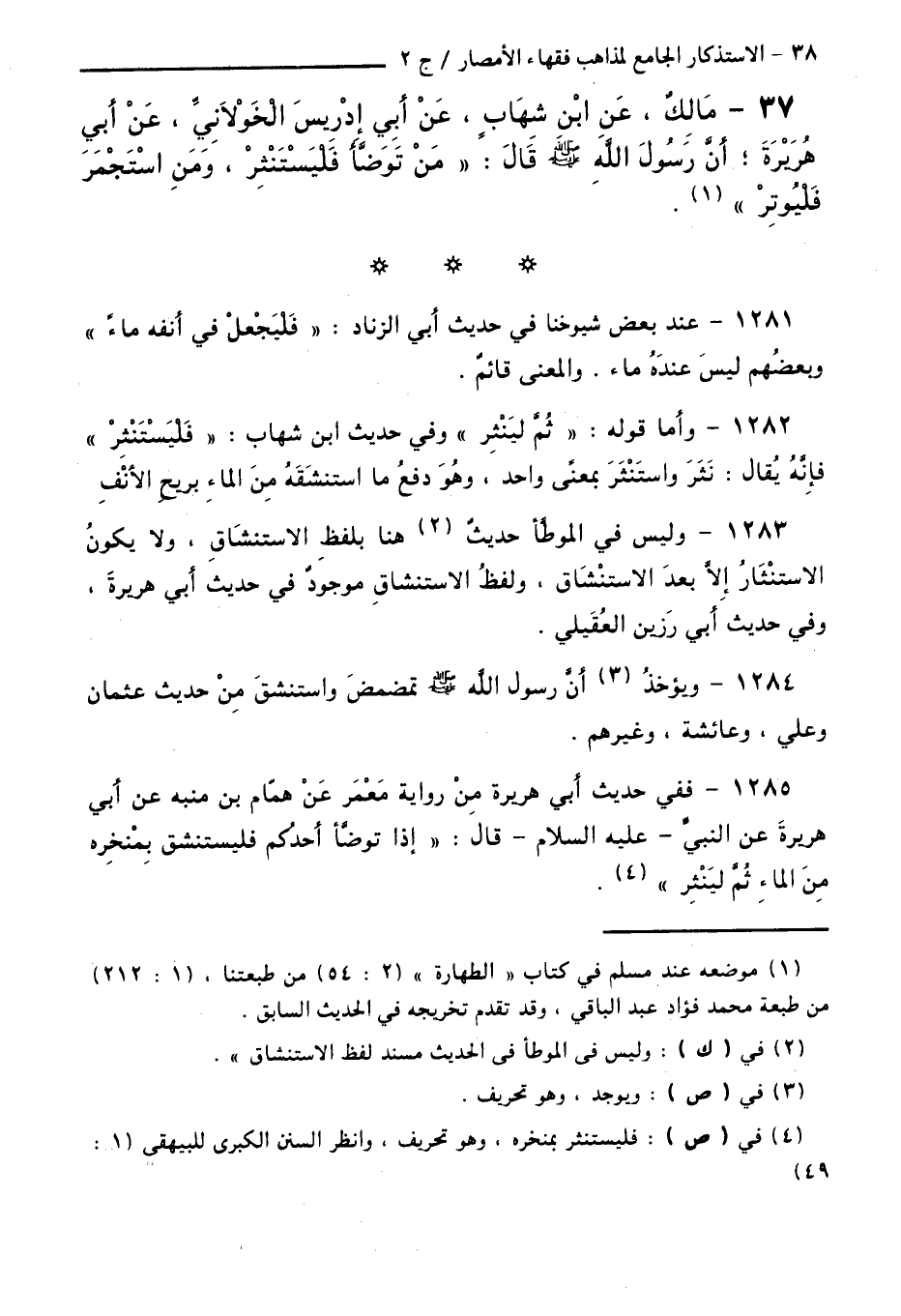 37 - مَالِكٌ، عَنِ ابْنِ شِهَابٍ، عَنْ أَبِي إِدْرِيسَ الْخَوْلَانِيِّ، عَنْ أَبِي هُرَيْرَةَ ؛ أَنَّ رَسُولَ اللَّهِ - صَلَّى اللَّهُ عَلَيْهِ وَسَلَّمَ - قَالَ: "مَنْ تَوَضَّأَ فَلْيَسْتَنْثِرْ، وَمَنِ اسْتَجْمَرَ فَلْيُوتِرْ ".
