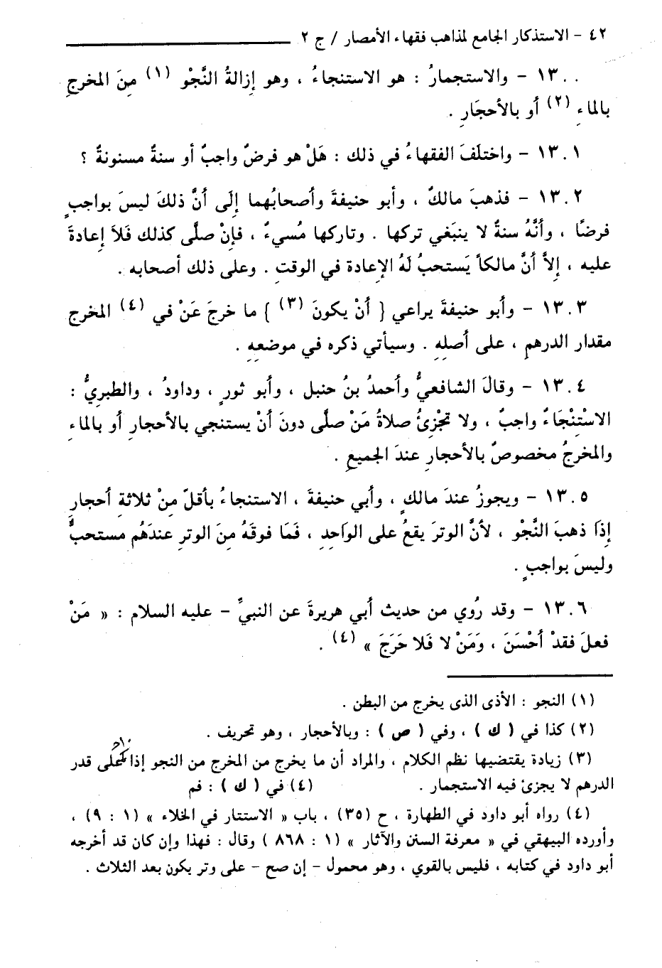 1304 - وَقَالَ الشَّافِعِيُّ، وَأَحْمَدُ بْنُ حَنْبَلٍ، وَأَبُو ثَوْرٍ، وَدَاوُدَ، وَالطَّبَرِيُّ: الِاسْتِنْجَاءُ وَاجِبٌ، وَلَا تُجْزِئُ صَلَاةُ مَنْ صَلَّى دُونَ أَنْ يَسْتَنْجِيَ بِالْأَحْجَارِ أَوْ بِالْمَاءِ. وَالْمَخْرَجُ مَخْصُوصٌ بِالْأَحْجَارِ عِنْدَ الْجَمِيعِ.