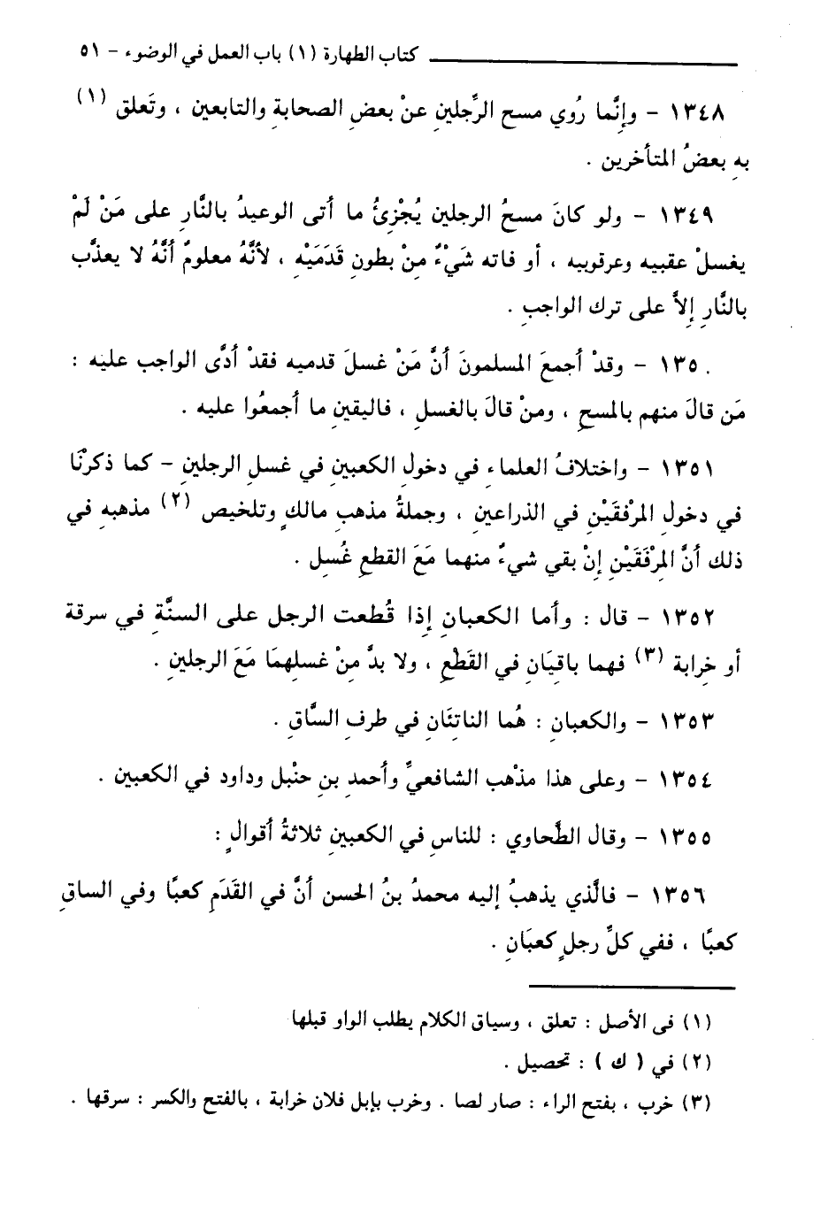 1351 - وَاخْتِلَافُ الْعُلَمَاءِ فِي دُخُولِ الْكَعْبَيْنِ فِي غَسْلِ الرِّجْلَيْنِ - كَمَا ذَكَرْنَا فِي دُخُولِ الْمِرْفَقَيْنِ فِي الذِّرَاعَيْنِ، وَجُمْلَةُ مَذْهَبِ مَالِكٍ وَتَلْخِيصُ مَذْهَبِهِ فِي ذَلِكَ أَنَّ الْمِرْفَقَيْنِ إِنْ بَقِيَ شَيْءٌ مِنْهُمَا مَعَ الْقَطْعِ غُسِلَ.