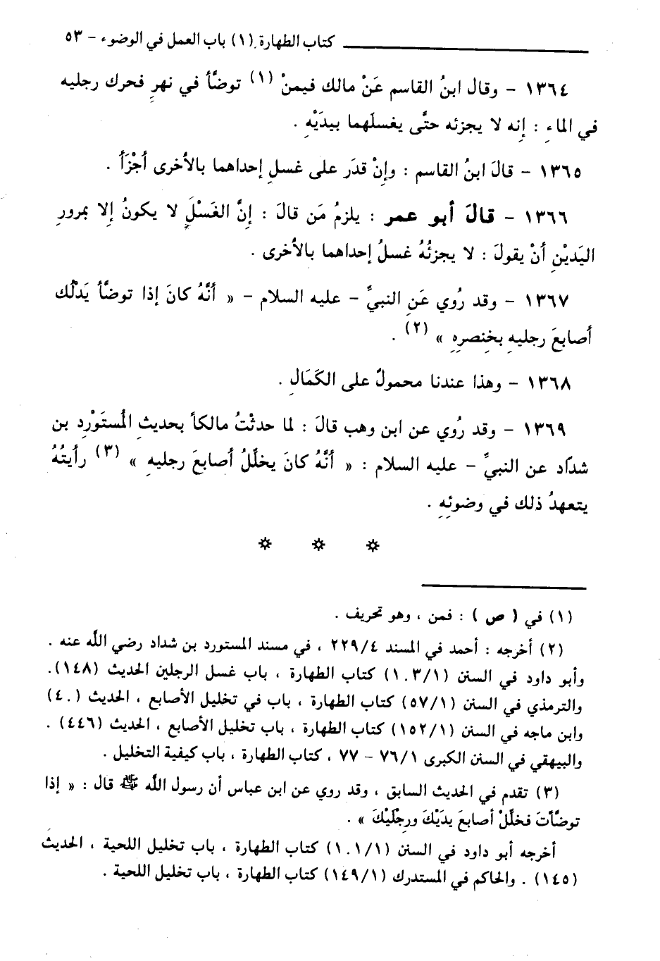 1369 - وَقَدْ رُوِيَ عَنِ ابْنِ وَهْبٍ قَالَ: لَمَّا حَدَّثْتُ مَالِكًا بِحَدِيثِ الْمُسْتَوْرِدِ بْنِ شَدَّادٍ عَنِ النَّبِيِّ - عَلَيْهِ السَّلَامُ - " أَنَّهُ كَانَ يُخَلِّلُ أَصَابِعَ رِجْلَيْهِ " رَأَيْتُهُ يَتَعَهَّدُ ذَلِكَ فِي وُضُوئِهِ.