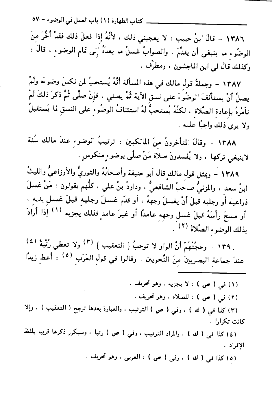 1388 - وَقَالَ الْمُتَأَخِّرُونَ مِنَ الْمَالِكِيِّينَ: تَرْتِيبُ الْوُضُوءِ عِنْدَ مَالِكٍ سُنَّةٌ لَا يَنْبَغِي تَرْكُهَا، وَلَا يُفْسِدُونَ صَلَاةَ مَنْ صَلَّى بِوُضُوءٍ مَنْكُوسٍ.