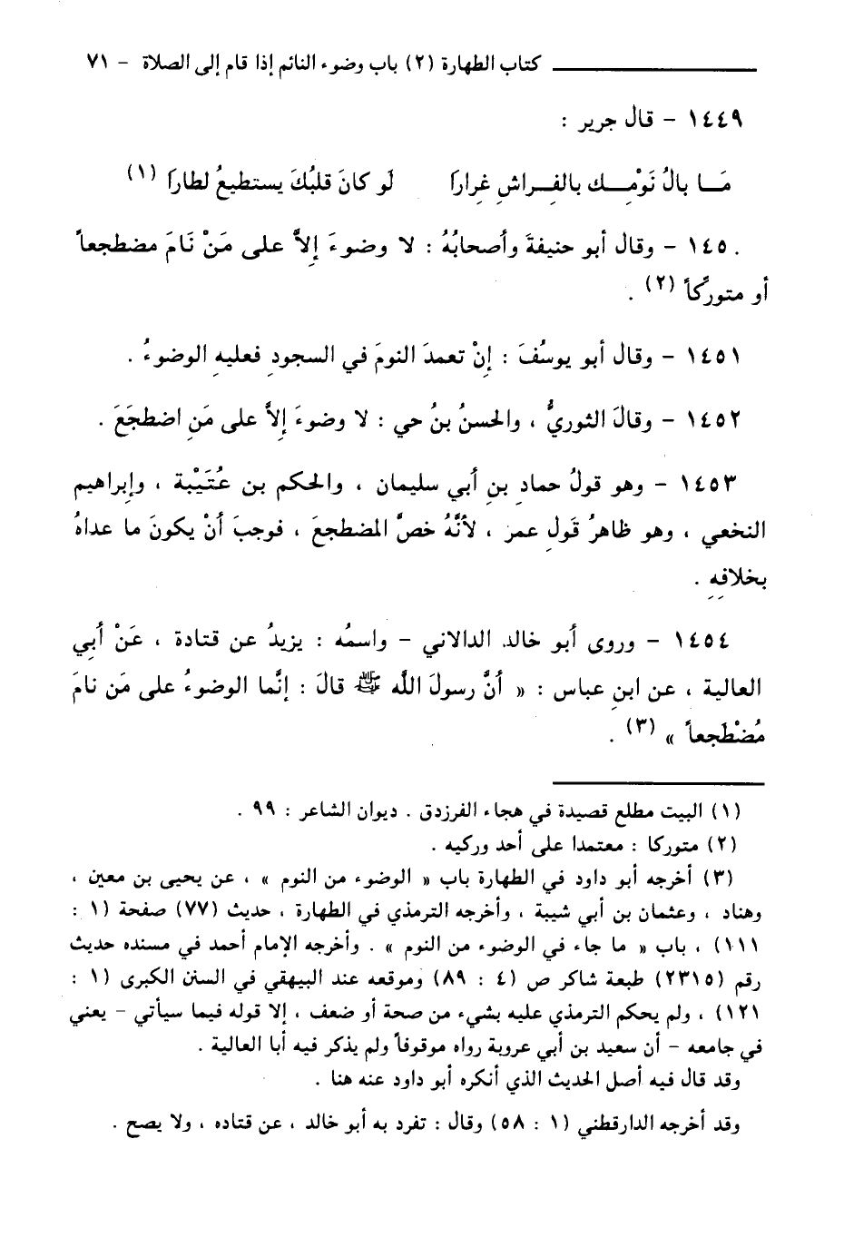 1450 - وَقَالَ أَبُو حَنِيفَةَ، وَأَصْحَابُهُ: لَا وُضُوءَ إِلَّا عَلَى مَنْ نَامَ مُضْطَجِعًا أَوْ مُتَوَرِّكًا.
