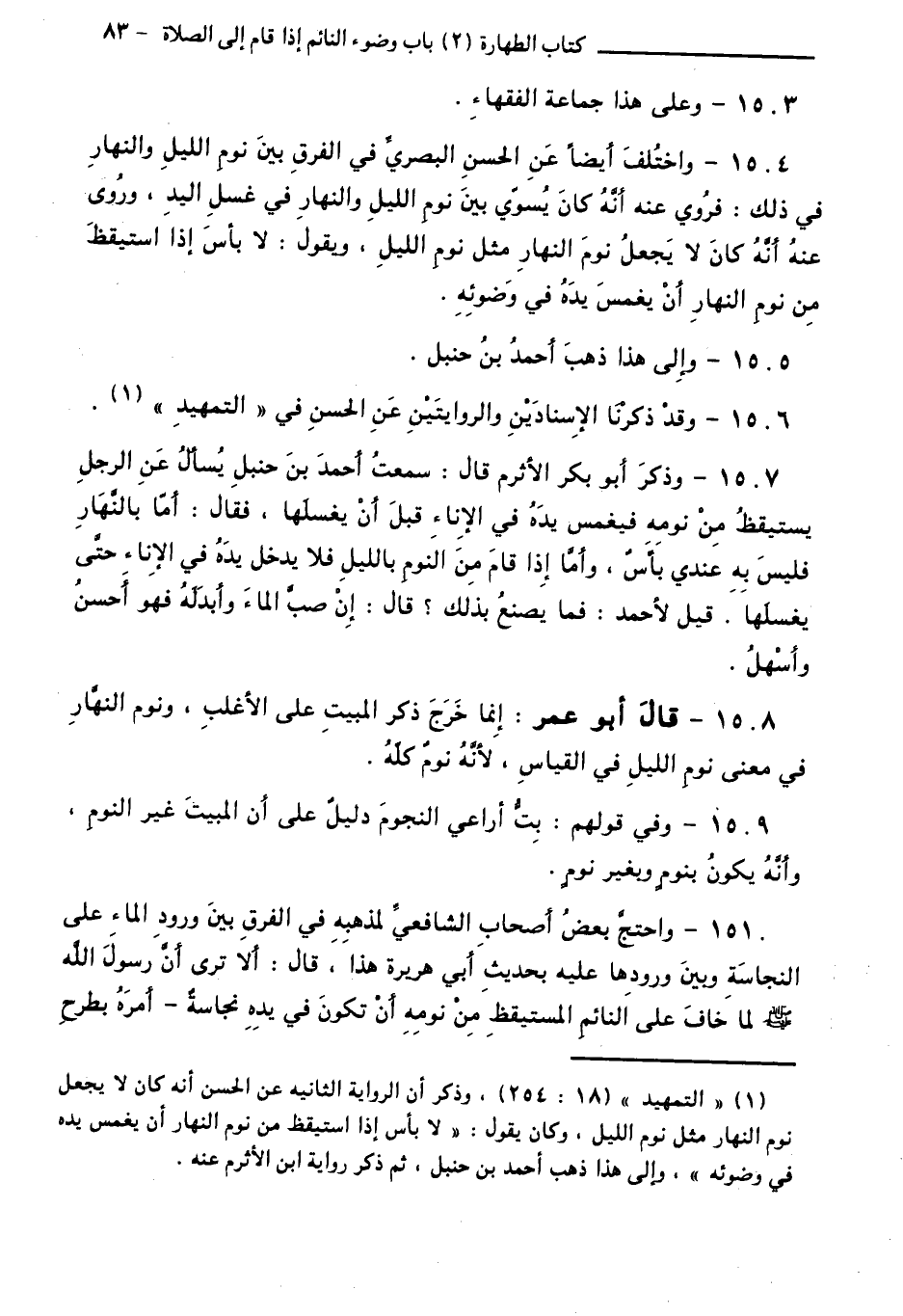 1504 - وَاخْتُلِفَ أَيْضًا عَنِ الْحَسَنِ الْبَصْرِيِّ فِي الْفَرْقِ بَيْنَ نَوْمِ اللَّيْلِ وَالنَّهَارِ فِي ذَلِكَ: فَرُوِيَ عَنْهُ أَنَّهُ كَانَ يُسَوِّي بَيْنَ نَوْمِ اللَّيْلِ وَالنَّهَارِ فِي غَسْلِ الْيَدِ، وَرُوِيَ عَنْهُ أَنَّهُ كَانَ لَا يَجْعَلُ نَوْمَ النَّهَارِ مِثْلَ نَوْمٍ اللَّيْلِ، وَيَقُولُ: لَا بَأْسَ إِذَا اسْتَيْقَظَ مِنْ نَوْمِ النَّهَارِ أَنْ يَغْمِسَ يَدَهُ فِي وَضُوئِهِ.
