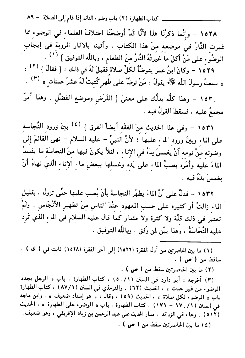 1532 - فَدَلَّ عَلَى أَنَّ الْمَاءَ يُطَهِّرُ النَّجَاسَةَ بِأَنْ يُصَبَّ عَلَيْهَا حَتَّى تَزُولَ، بِقَلِيلِ الْمَاءِ زَالَتْ أَوْ كَثِيرِهِ عَلَى حَسَبِ الْمَعْهُودِ عِنْدَ النَّاسِ مِنْ تَطْهِيرِ الْأَنْجَاسِ. وَلَمْ تُعْتَبَرْ فِي ذَلِكَ قِلَّةٌ وَلَا كَثْرَةٌ وَلَا مِقْدَارٌ كَمَا قَالَ - عَلَيْهِ السَّلَامُ - فِي الْمَاءِ الَّذِي تَرِدُ عَلَيْهِ النَّجَاسَةُ، وَهَذَا بَيِّنٌ لِمَنْ وُفِّقَ، وَبِاللَّهِ التَّوْفِيقُ.