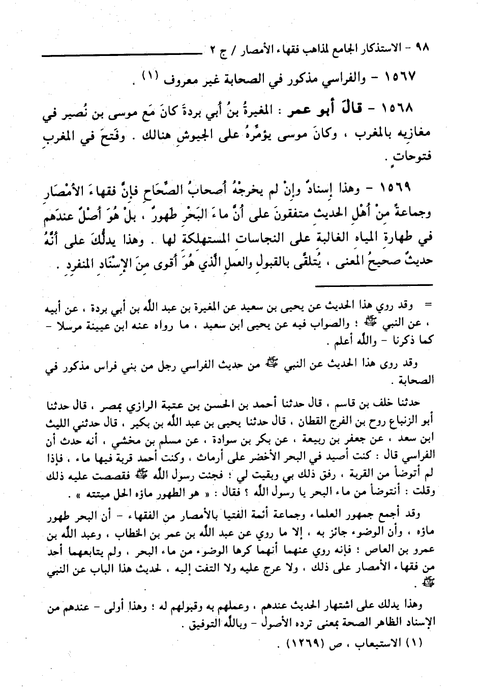 1569 - وَهَذَا إِسْنَادٌ وَإِنْ لَمْ يُخْرِجْهُ أَصْحَابُ الصِّحَاحِ فَإِنَّ فُقَهَاءَ الْأَمْصَارِ وَجَمَاعَةً مِنْ أَهْلِ الْحَدِيثِ مُتَّفِقُونَ عَلَى أَنَّ مَاءَ الْبَحْرِ طَهُورٌ، بَلْ هُوَ أَصْلٌ عِنْدَهُمْ فِي طَهَارَةِ الْمِيَاهِ الْغَالِبَةِ عَلَى النَّجَاسَاتِ الْمُسْتَهْلِكَةِ لَهَا. وَهَذَا يَدُلُّكَ عَلَى أَنَّهُ حَدِيثٌ صَحِيحُ الْمَعْنَى، يُتَلَقَّى بِالْقَبُولِ وَالْعَمَلِ الَّذِي هُوَ أَقْوَى مِنَ الْإِسْنَادِ الْمُنْفَرِدِ.