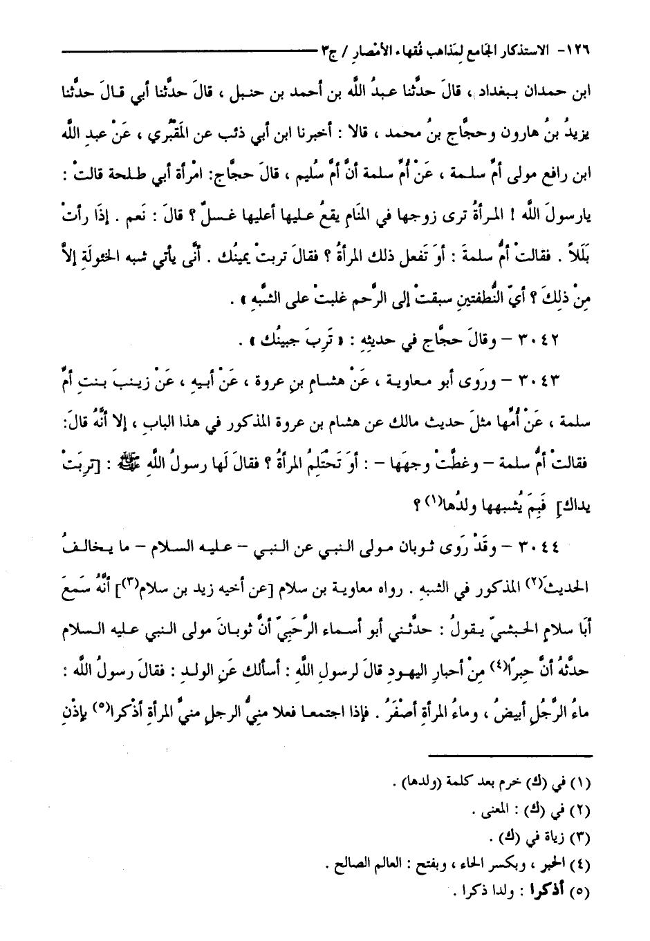 بْنِ حَمْدَانَ بِبَغْدَادَ، قَالَ حَدَّثَنَا عَبْدُ اللَّهِ بْنُ أَحْمَدَ بْنِ حَنْبَلٍ، قَالَ حَدَّثَنَا أَبِي قَالَ حَدَّثْنَا يَزِيدُ بْنُ هَارُونَ وَحَجَّاجُ بْنُ مُحَمَّدٍ، قَالَا: أَخْبَرَنَا ابْنُ أَبِي ذِئْبٍ عَنِ الْمَقْبُرِيِّ، عَنْ عَبْدِ اللَّهِ بْنِ رَافِعٍ مَوْلَى أُمِّ سَلَمَةَ، عَنْ أُمِّ سَلَمَةَأَنَّ أُمَّ سُلَيْمٍ - قَالَ حَجَّاجٌ: امْرَأَةُ أَبِي طَلْحَةَ - قَالَتْ: يَا رَسُولَ اللَّهِ ! الْمَرْأَةُ تَرَى زَوْجَهَا فِي الْمَنَامِ يَقَعُ عَلَيْهَا أَعَلَيْهَا غُسْلٌ ؟ قَالَ: نَعَمْ. إِذَا رَأَتْ بَلَلًا. فَقَالَتْ أُمُّ سَلَمَةَ: أَوَ تَفْعَلُ ذَلِكَ الْمَرْأَةُ ؟ فَقَالَ: تَرِبَتْ يَمِينُكِ. أَنَّى يَأْتِي شَبَهُ الْخُئُولَةِ إِلَّا مِنْ ذَلِكَ ؟ أَيُّ النُّطْفَتَيْنِ سَبَقَتْ إِلَى الرَّحِمِ غَلَبَتْ عَلَى الشَّبَهِ ".