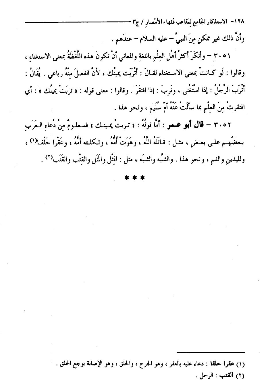 3052 - قَالَ أَبُو عُمَرَ: أَمَّا قَوْلُهُ " تَرِبَتْ يَمِينُكِ " فَمَعْلُومٌ مِنْ دُعَاءِ الْعَرَبِ بَعْضُهُمْ عَلَى بَعْضٍ، مِثْلُ: قَاتَلَهُ اللَّهُ، وَهَوَتْ أُمُّهُ، وَثَكِلَتْهُ أُمُّهُ، وَعَقْرَا حَلْقَا، وَلِلْيَدَيْنِ وَالْفَمِ، وَنَحْوِ هَذَا. وَالشِّبْهُ وَالشَّبَهُ، مِثْلُ: الْمِثْلِ وَالْمَثَلِ وَالْقِتْبِ وَالْقَتَبِ.
