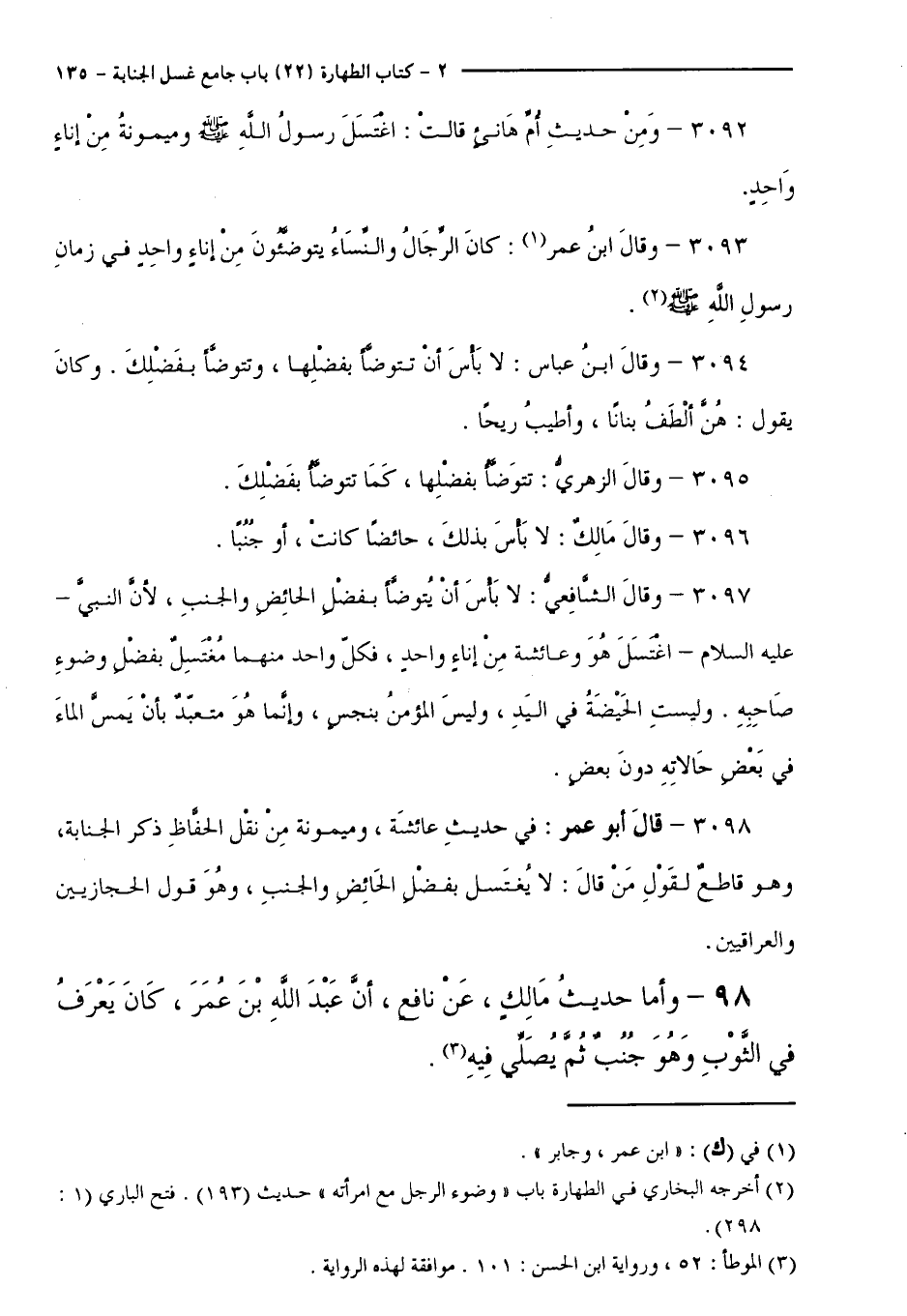 3098 - قَالَ أَبُو عُمَرَ: فِي حَدِيثِ عَائِشَةَ، وَمَيْمُونَةَ مِنْ نَقْلِ الْحُفَّاظِ ذِكْرُ الْجَنَابَةِ، وَهُوَ قَاطِعٌ لِقَوْلِ مَنْ قَالَ: لَا يَغْتَسِلُ بِفَضْلِ الْحَائِضِ وَالْجُنُبِ، وَهُوَ قَوْلُ الْحِجَازِيِّينَ وَالْعِرَاقِيِّينَ.