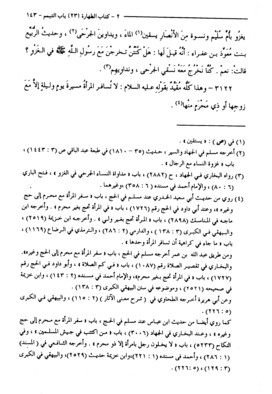 3122 - وَهَذَا كُلُّهُ مُقَيَّدٌ بِقَوْلِهِ عَلَيْهِ السَّلَامُ:لَا تُسَافِرُ الْمَرْأَةُ مَسِيرَةَ يَوْمٍ وَلَيْلَةٍ إِلَّا مَعَ زَوْجِهَا أَوْ ذِي مَحْرَمٍ مِنْهَا.