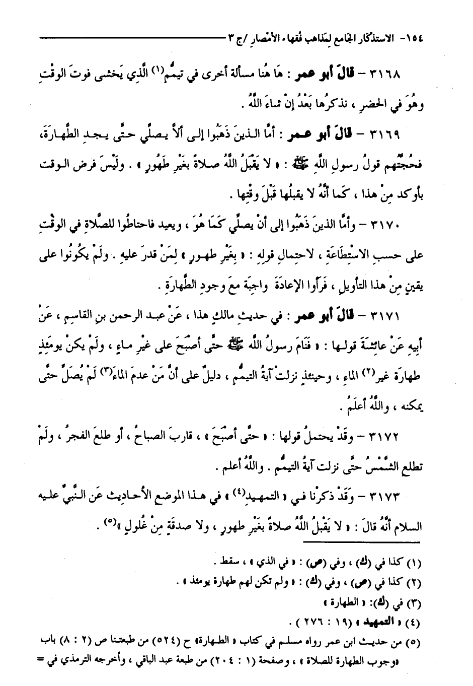 3168 - قَالَ أَبُو عُمَرَ: هَا هُنَا مَسْأَلَةٌ أُخْرَى فِي تَيَمُّمِ الَّذِي يَخْشَى فَوْتَ الْوَقْتِ وَهُوَ فِي الْحَضَرِ، نَذْكُرُهَا بَعْدُ إِنْ شَاءَ اللَّهُ.
