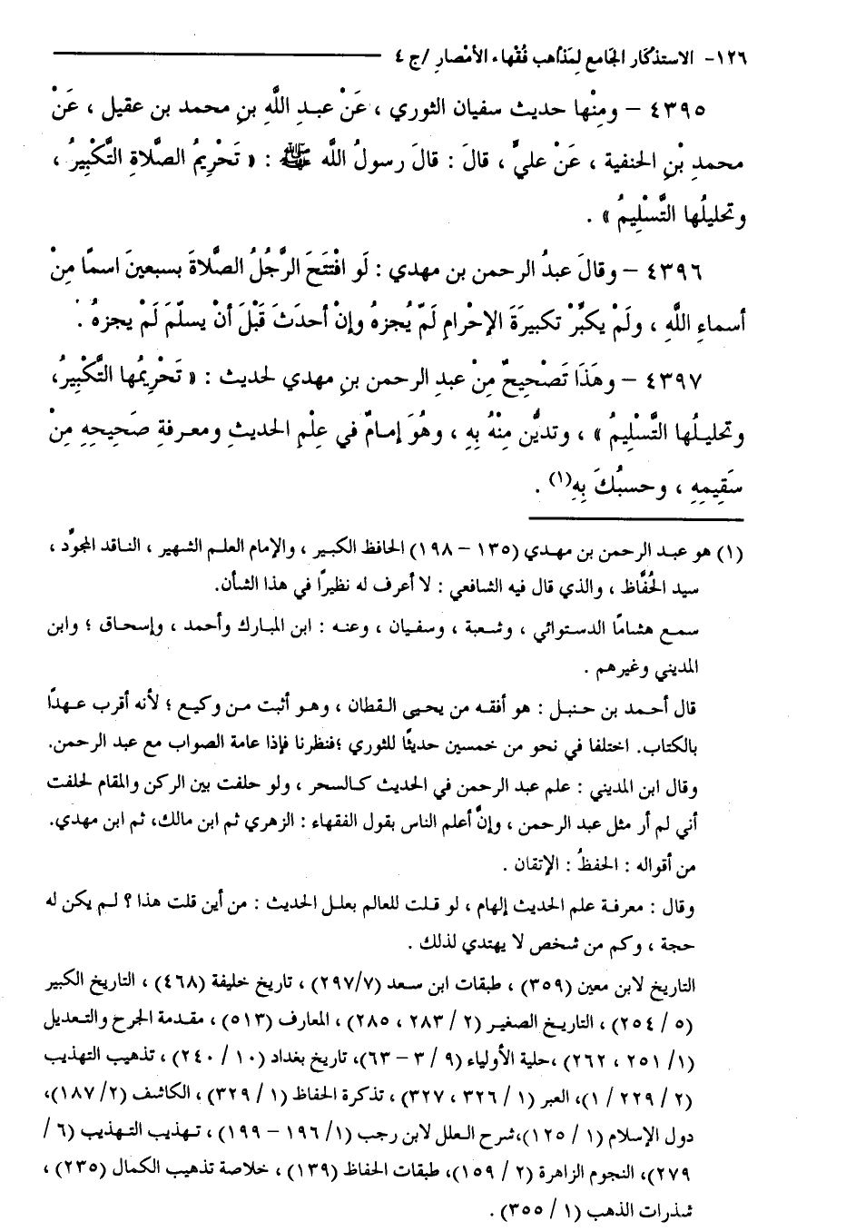 4397 - وَهَذَا تَصْحِيحٌ مِنْ عَبْدِ الرَّحْمَنِ بْنِ مَهْدِيٍّ لِحَدِيثِ: "تَحْرِيمُهَا التَّكْبِيرُ، وَتَحْلِيلُهَا التَّسْلِيمُ " - وَتَدَيُّنٌ مِنْهُ بِهِ، وَهُوَ إِمَامٌ فِي عِلْمِ الْحَدِيثِ وَمَعْرِفَةِ صَحِيحِهِ مِنْ سَقِيمِهِ، وَحَسْبُكَ بِهِ.