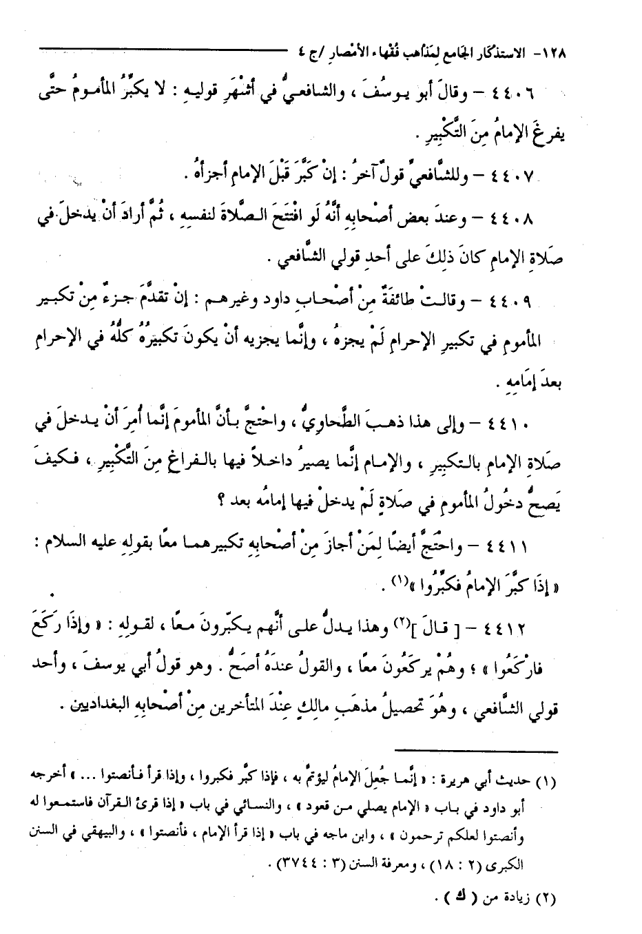 4409 - وَقَالَتْ طَائِفَةٌ مِنْ أَصْحَابِ دَاوُدَ وَغَيْرِهِمْ: إِنْ تَقَدَّمَ جُزْءٌ مِنْ تَكْبِيرِ الْمَأْمُومِ فِي تَكْبِيرِ الْإِحْرَامِ لَمْ يُجْزِهِ، وَإِنَّمَا يُجْزِيهِ أَنْ يَكُونَ تَكْبِيرُهُ كُلُّهُ فِي الْإِحْرَامِ بَعْدَ إِمَامِهِ.