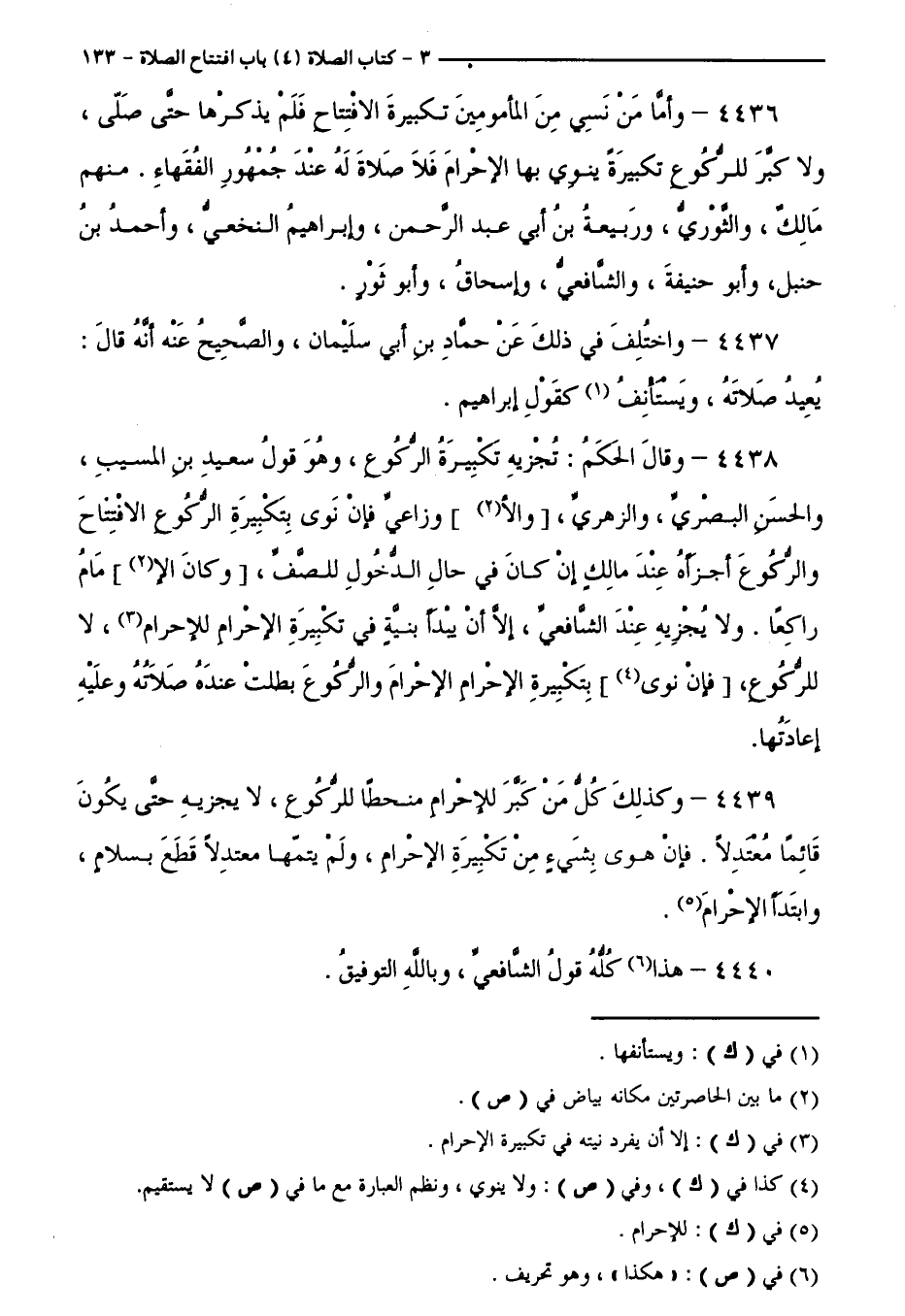 4436 - وَأَمَّا مَنْ نَسِيَ مِنَ الْمَأْمُومِينَ تَكْبِيرَةَ الِافْتِتَاحِ فَلَمْ يَذْكُرْهَا حَتَّى صَلَّى، وَلَا كَبَّرَ لِلرُّكُوعِ تَكْبِيرَةً يَنْوِي بِهَا الْإِحْرَامَ - فَلَا صَلَاةَ لَهُ عِنْدَ جُمْهُورِ الْفُقَهَاءِ، مِنْهُمْ: مَالِكٌ، وَالثَّوْرِيُّ، وَرَبِيعَةُ بْنُ أَبِي عَبْدِ الرَّحْمَنِ، وَإِبْرَاهِيمُ النَّخَعِيُّ، وَأَحْمَدُ بْنُ حَنْبَلٍ، وَأَبُو حَنِيفَةَ، وَالشَّافِعِيُّ، وَإِسْحَاقُ، وَأَبُو ثَوْرٍ.