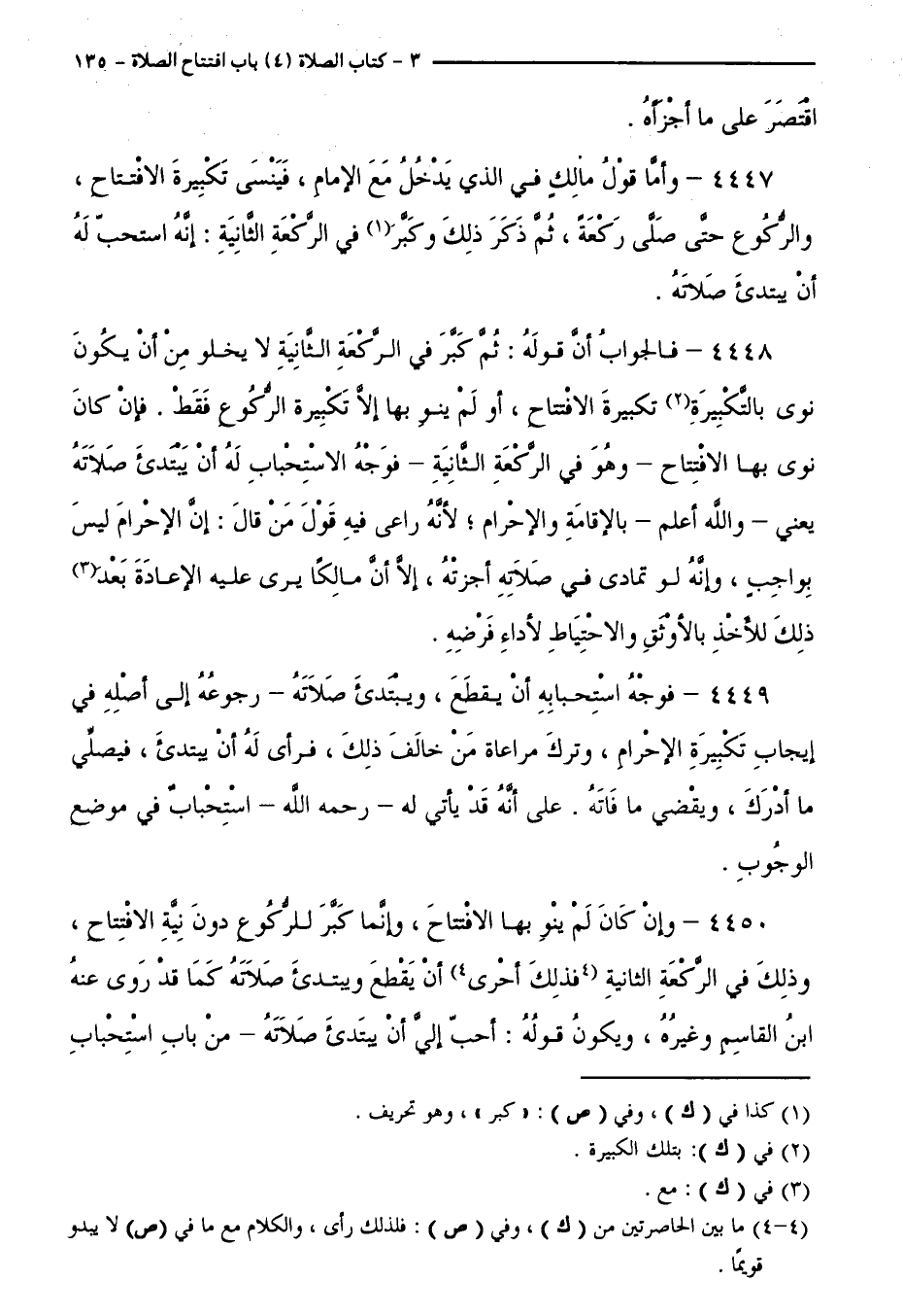 4450 - وَإِنْ كَانَ لَمْ يَنْوِ بِهَا الِافْتِتَاحَ، وَإِنَّمَا كَبَّرَ لِلرُّكُوعِ دُونَ نِيَّةِ الِافْتِتَاحِ، وَذَلِكَ فِي الرَّكْعَةِ الثَّانِيَةِ ( فَذَلِكَ أَحْرَى ) أَنْ يَقْطَعَ وَيَبْتَدِئَ صَلَاتَهُ كَمَا قَدْ رَوَى عَنْهُ ابْنُ الْقَاسِمِ وَغَيْرُهُ، وَيَكُونُ قَوْلُهُ: أَحَبُّ إِلَيَّ أَنْ يَبْتَدِئَ صَلَاتَهُ. مِنْ بَابِ اسْتِحْبَابِ