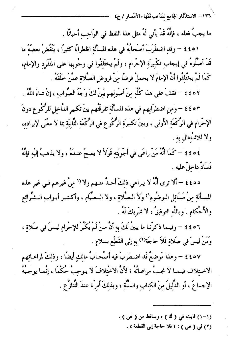 4451 - وَقَدِ اضْطَرَبَ أَصْحَابُهُ فِي هَذِهِ الْمَسْأَلَةِ اضْطِرَابًا كَثِيرًا، يَنْقُضُ بَعْضُهُ مَا قَدْ أَصَّلُوهُ فِي إِيجَابِ تَكْبِيرَةِ الْإِحْرَامِ، وَلَمْ يَخْتَلِفُوا فِي وُجُوبِهَا عَلَى الْمُنْفَرِدِ وَالْإِمَامِ، كَمَا لَمْ يَخْتَلِفُوا أَنَّ الْإِمَامَ لَا يَحْمِلُ فَرْضًا مِنْ فُرُوضِ الصَّلَاةِ عَمَّنْ خَلْفَهُ.