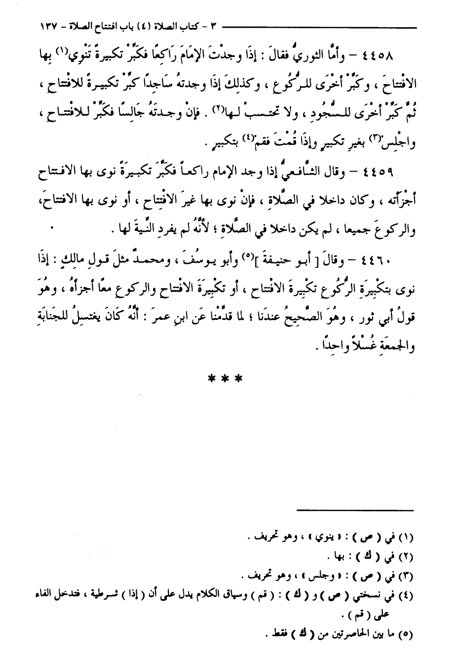 4458 - وَأَمَّا الثَّوْرِيُّ فَقَالَ: إِذَا وَجَدْتَ الْإِمَامَ رَاكِعًا فَكَبِّرْ تَكْبِيرَةً تَنْوِي بِهَا الِافْتِتَاحَ، وَكِبِّرْ أُخْرَى لِلرُّكُوعِ، وَكَذَلِكَ إِذَا وَجَدْتَهُ سَاجِدًا كَبِّرْ تَكْبِيرَةً لِلِافْتِتَاحِ، ثُمَّ كَبِّرْ أُخْرَى لِلسُّجُودِ، وَلَا تَحْتَسِبْ لَهَا. فَإِنْ وَجَدْتَهُ جَالِسًا فَكَبِّرْ لِلِافْتِتَاحِ، وَاجْلِسْ بِغَيْرِ تَكْبِيرَةٍ، وَإِذَا قُمْتَ فَقُمْ بِتَكْبِيرٍ.