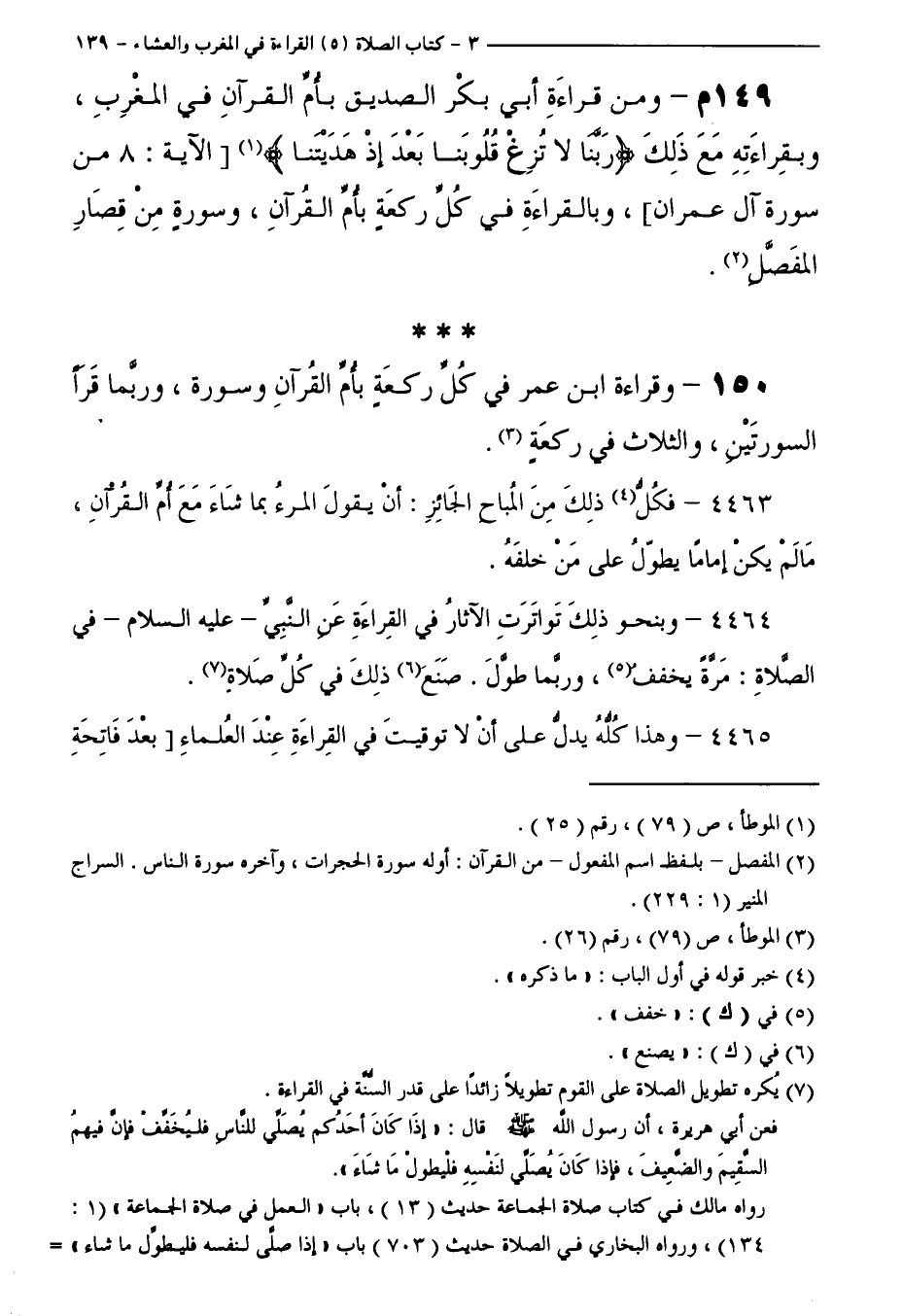 149 م - وَمِنْ قِرَاءَةِ أَبِي بَكْرٍ الصِّدِّيقِ بِأُمِّ الْقُرْآنِ فِي الْمَغْرِبِ، وَبِقِرَاءَتِهِ مَعَ ذَلِكَ: "رَبَّنَا لَا تُزِغْ قُلُوبَنَا بَعْدَ إِذْ هَدَيْتَنَا " [ الْآيَةَ 8 مِنْ سُورَةِ آلِ عِمْرَانَ ]، وَبِالْقِرَاءَةِ فِي كُلِّ رَكْعَةٍ بِأُمِّ الْقُرْآنِ، وَسُورَةٍ مِنْ قِصَارِ الْمُفَصَّلِ.