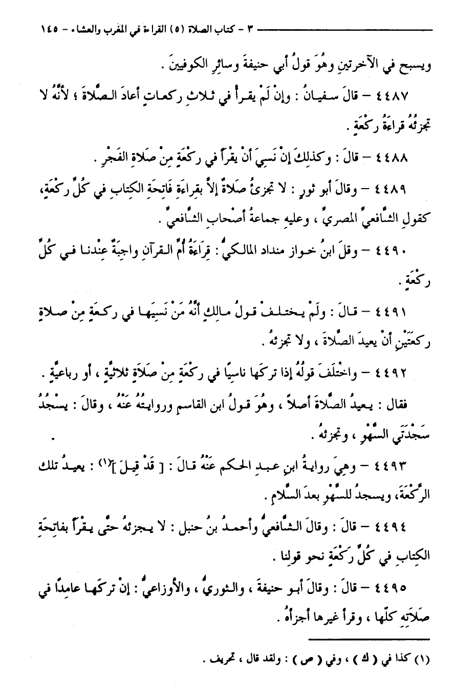 4487 - قَالَ سُفْيَانُ: وَإِنْ لَمْ يَقْرَأْ فِي ثَلَاثِ رَكَعَاتٍ أَعَادَ الصَّلَاةَ ; لِأَنَّهُ لَا تُجْزِئُهُ قِرَاءَةُ رَكْعَةٍ.
