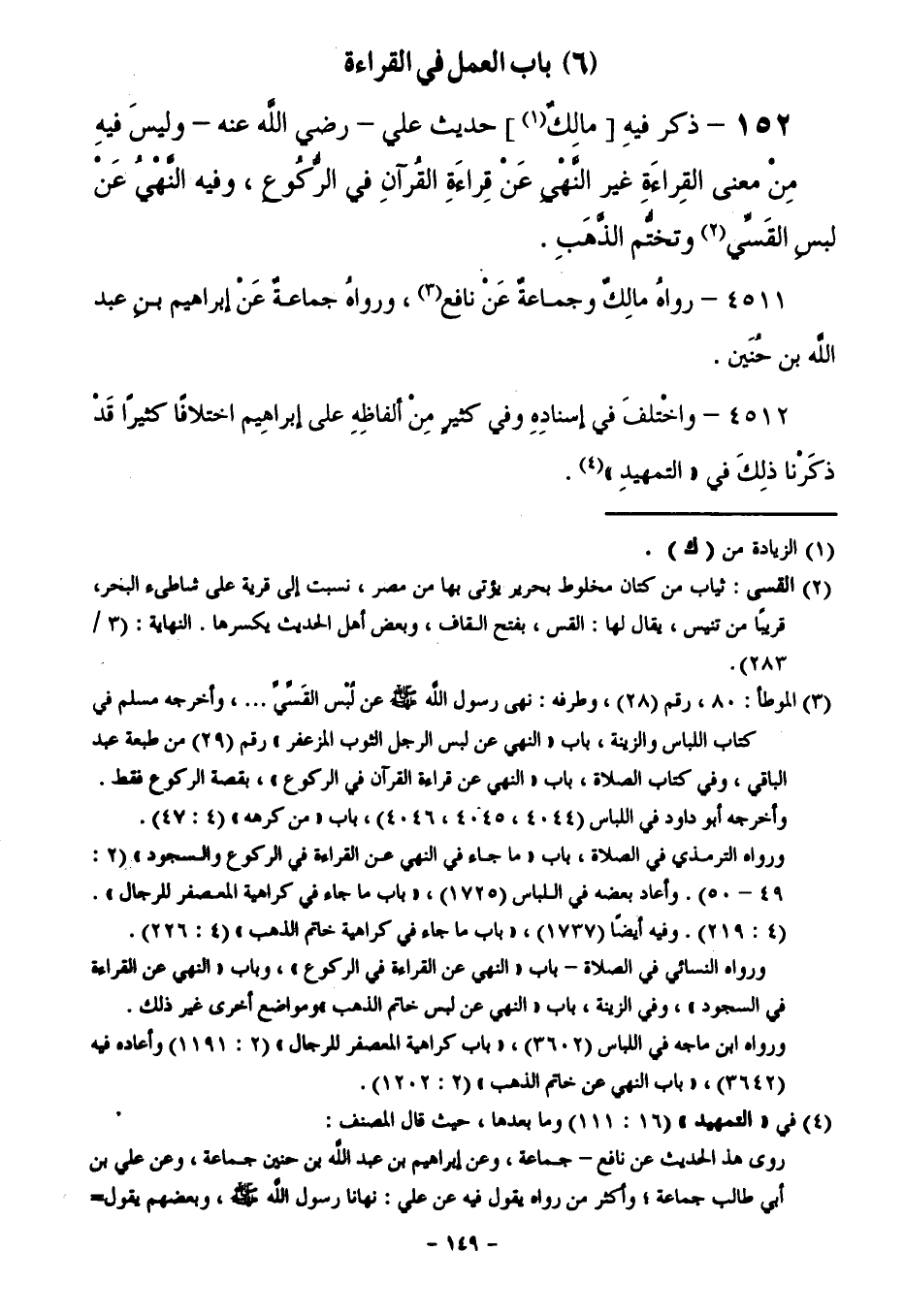 152 - ذَكَرَ فِيهِ مَالِكٌ حَدِيثَ عَلِيٍّ - رَضِيَ اللَّهُ عَنْهُ - وَلَيْسَ فِيهِ مِنْ مَعْنَى الْقِرَاءَةِ غَيْرُ النَّهْيِ عَنْ قِرَاءَةِ الْقُرْآنِ فِي الرُّكُوعِ، وَفِيهِ النَّهْيُ عَنْ لُبْسِ الْقِسِيِّ، وَتَخَتُّمِ الذَّهَبِ.