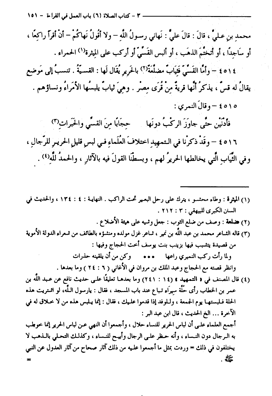 4516 - وَقَدْ ذَكَرْنَا فِي التَّمْهِيدِ اخْتِلَافَ الْعُلَمَاءِ فِي لُبْسِ قَلِيلِ الْحَرِيرِ لِلرِّجَالِ، وَفِي الثِّيَابِ الَّتِي يُخَالِطُهَا الْحَرِيرُ لَهُمْ، وَبَسَطْنَا الْقَوْلَ فِيهِ بِالْآثَارِ. وَالْحَمْدُ لِلَّهِ.