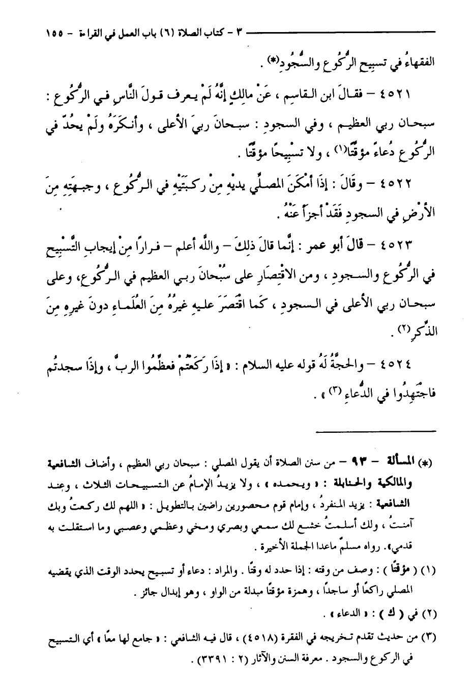 4521 - فَقَالَ ابْنُ الْقَاسِمِ عَنْ مَالِكٍ: إِنَّهُ لَمْ يَعْرِفْ قَوْلَ النَّاسِ فِي الرُّكُوعِ: سُبْحَانَ رَبِّيَ الْعَظِيمِ، وَفِي السُّجُودِ: سُبْحَانَ رَبِّيَ الْأَعْلَى، وَأَنْكَرَهُ، وَلَمْ يَحُدَّ فِي الرُّكُوعِ دُعَاءً مُؤَقَّتًا، وَلَا تَسْبِيحًا مُؤَقَّتًا.