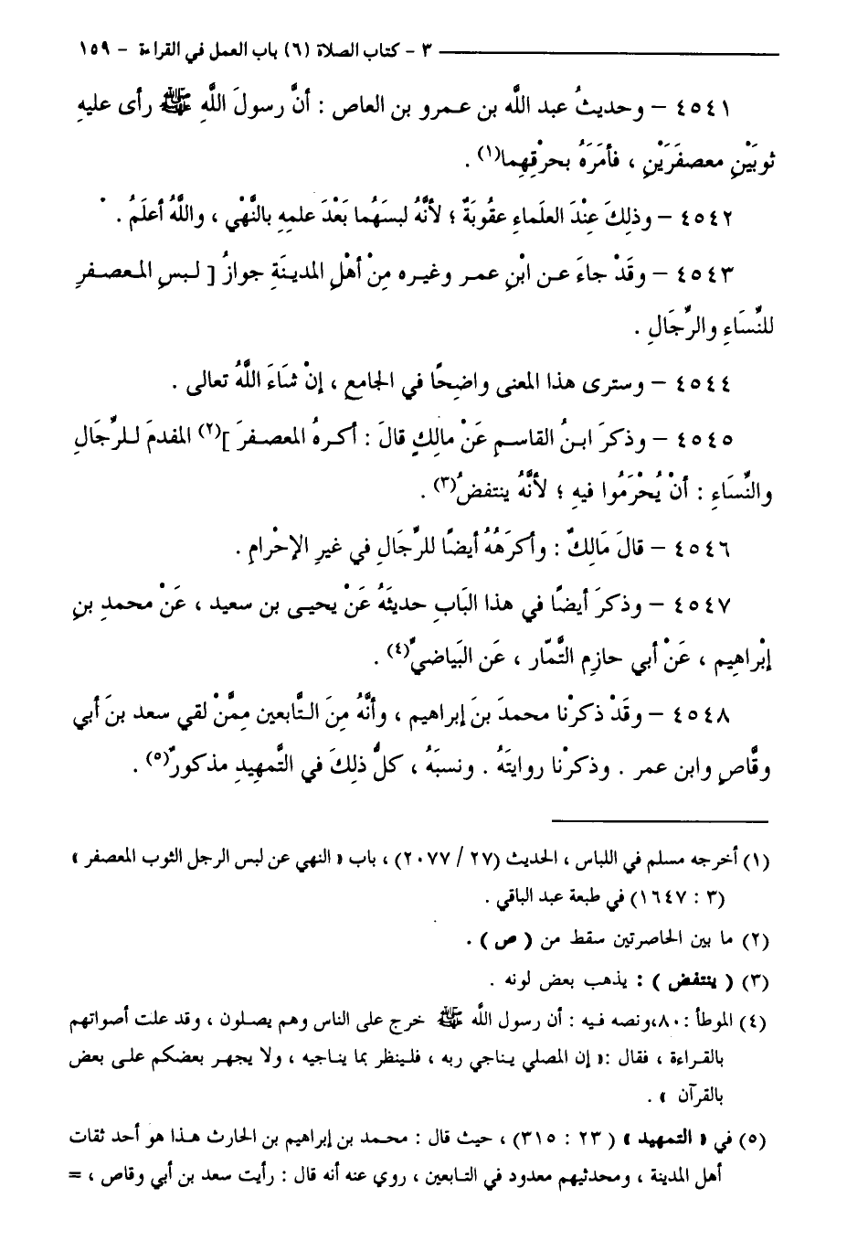 4543 - وَقَدْ جَاءَ عَنِ ابْنِ عُمَرَ وَغَيْرِهِ مِنْ أَهْلِ الْمَدِينَةِ - جَوَازُ لُبْسِ الْمُعَصْفَرِ لِلنِّسَاءِ وَالرِّجَالِ.