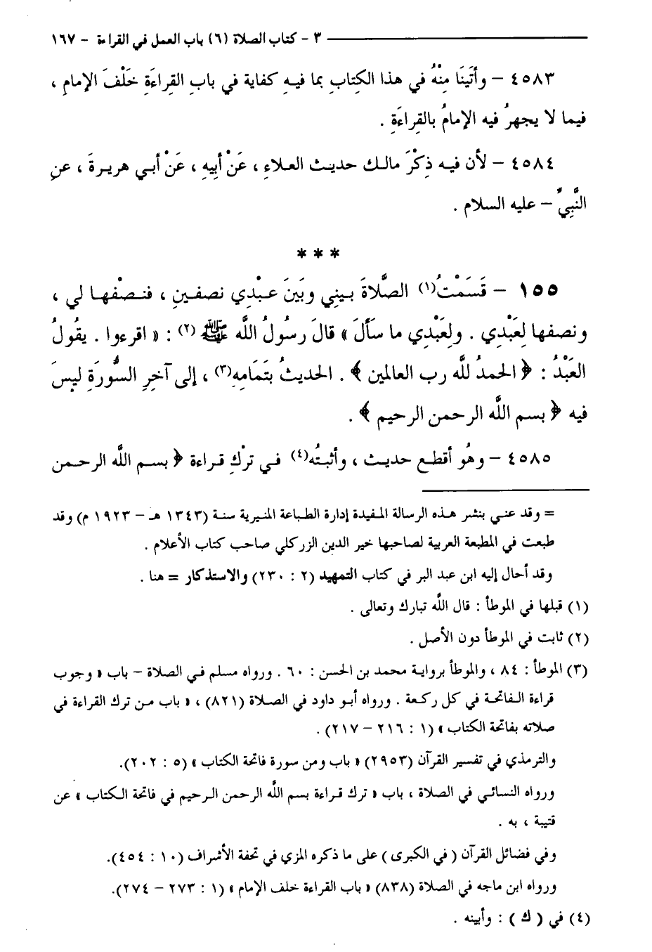 155 -قَسَّمْتُ الصَّلَاةَ بَيْنِي وَبَيْنَ عَبْدِي نِصْفَيْنِ ; فَنِصْفُهَا لِي، وَنِصْفُهَا لِعَبْدِي. وَلِعَبْدِي مَا سَأَلَ " قَالَ رَسُولُ اللَّهِ - صَلَّى اللَّهُ عَلَيْهِ وَسَلَّمَ -: " اقْرَؤُوا ;يَقُولُ الْعَبْدُ: "الْحَمْدُ لِلَّهِ رَبِّ الْعَالَمِينَ " الْحَدِيثُ بِتَمَامِهِ إِلَى آخَرِ السُّورَةِ لَيْسَ فِيهِ "بِسْمِ اللَّهِ الرَّحْمَنِ الرَّحِيمِ ".