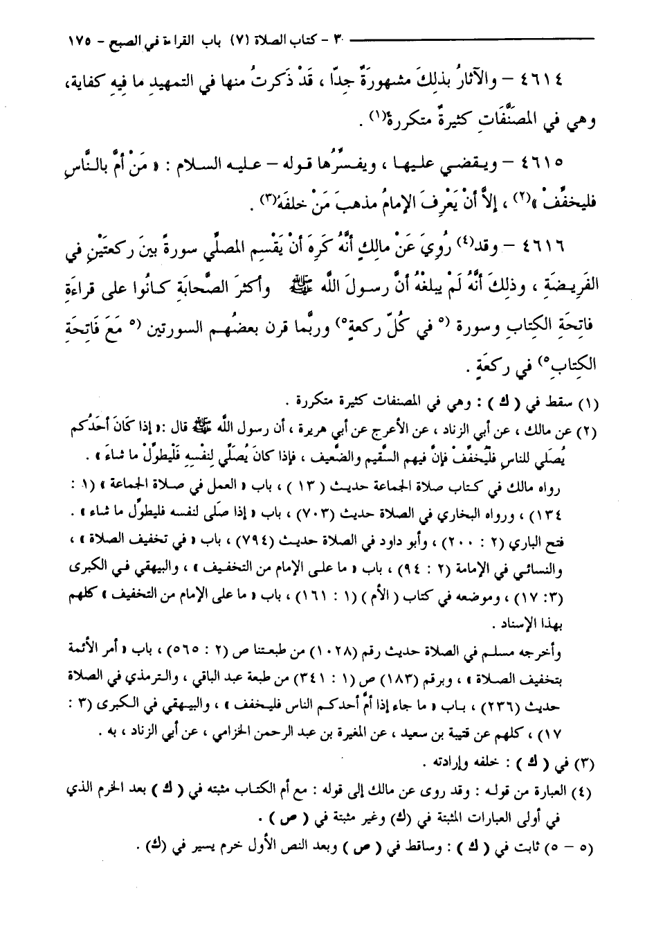 4615 - وَيَقْضِي عَلَيْهَا وَيُفَسِّرُهَا قَوْلُهُ - عَلَيْهِ السَّلَامُ: "مَنْ أَمَّ بِالنَّاسِ فَلْيُخَفِّفْ "، إِلَّا أَنْ يَعْرِفَ الْإِمَامُ مَذْهَبَ مَنْ خَلْفَهُ.