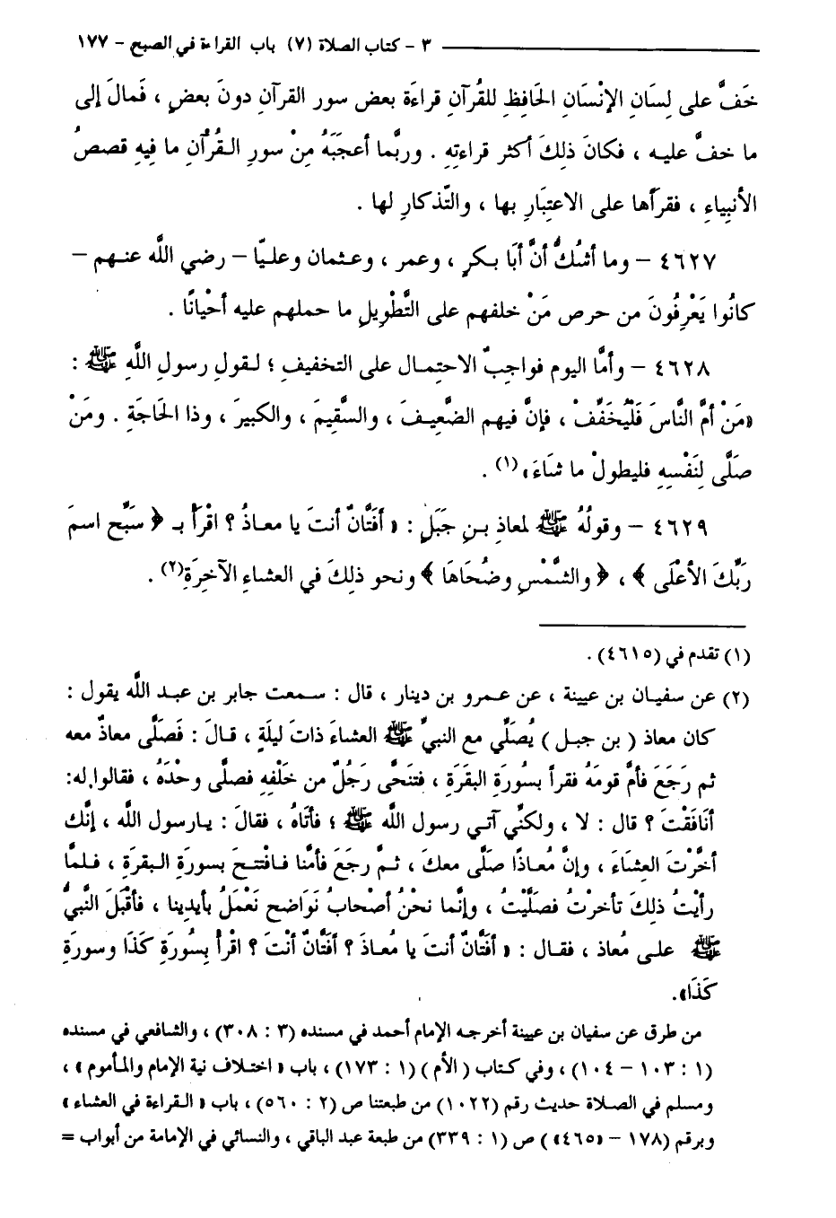 4629 - وَقَوْلُهُ - صَلَّى اللَّهُ عَلَيْهِ وَسَلَّمَ - لِمُعَاذِ بْنِ جَبَلٍ: "أَفَتَّانٌ أَنْتَ يَا مُعَاذُ ؟ اقْرَأْ بِ "سَبِّحِ اسْمَ رَبِّكَ الْأَعْلَى "، "وَالشَّمْسِ وَضُحَاهَا " وَنَحْوِ ذَلِكَ فِي الْعِشَاءِ الْآخِرَةِ.