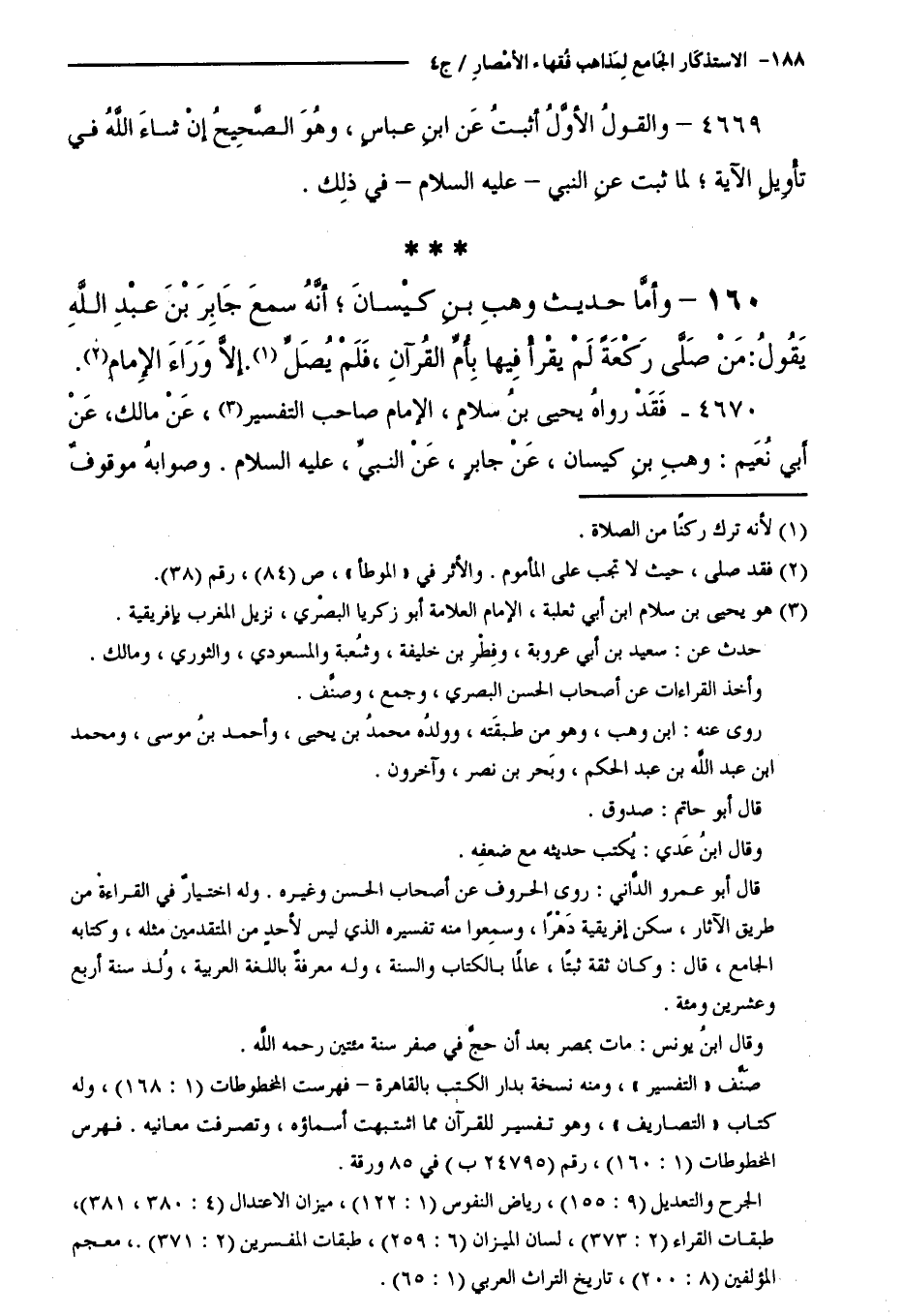 160 - وَأَمَّا حَدِيثُ وَهْبِ بْنِ كَيْسَانَ أَنَّهُ سَمِعَ جَابِرَ بْنَ عَبْدِ اللَّهِ يَقُولُ: مَنْ صَلَّى رَكْعَةً لَمْ يَقْرَأْ فِيهَا بِأُمِّ الْقُرْآنِ - فَلَمْ يُصَلِّ، إِلَّا وَرَاءَ الْإِمَامِ.