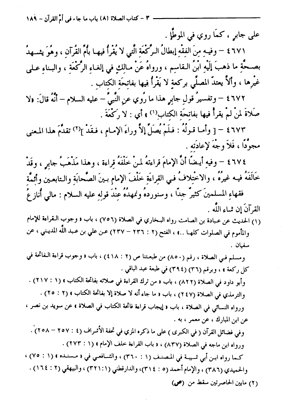 4674 - وَفِيهِ أَيْضًا أَنَّ الْإِمَامَ قِرَاءَتُهُ لِمَنْ خَلْفَهُ قِرَاءَةٌ، وَهَذَا مَذْهَبُ جَابِرٍ، وَقَدْ خَالَفَهُ فِيهِ غَيْرُهُ، وَالِاخْتِلَافُ فِي الْقِرَاءَةِ خَلْفَ الْإِمَامِ بَيْنَ الصَّحَابَةِ وَالتَّابِعِينَ وَأَئِمَّةِ فُقَهَاءِ الْمُسْلِمِينَ - كَثِيرٌ جِدًّا، وَسَنُورِدُهُ، وَنُمَهِّدُهُ عِنْدَ قَوْلِهِ - عَلَيْهِ السَّلَامُ -: "مَالِي أُنَازَعُ الْقُرْآنَ " - إِنْ شَاءَ اللَّهُ -.