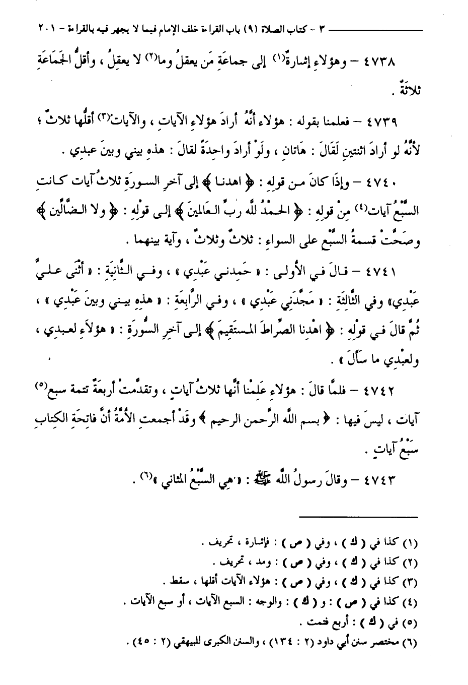 4742 - فَلَمَّا قَالَ: هَؤُلَاءِ عَلِمْنَا أَنَّهَا ثَلَاثُ آيَاتٍ، وَتَقَدَّمَتْ أَرْبَعَةٌ تَتِمَّةُ سَبْعِ آيَاتٍ، لَيْسَ فِيهَا " بِسْمِ اللَّهِ الرَّحْمَنِ الرَّحِيمِ "، وَقَدْ أَجْمَعَتِ الْأُمَّةُ أَنَّ فَاتِحَةَ الْكِتَابِ سَبْعُ آيَاتٍ.