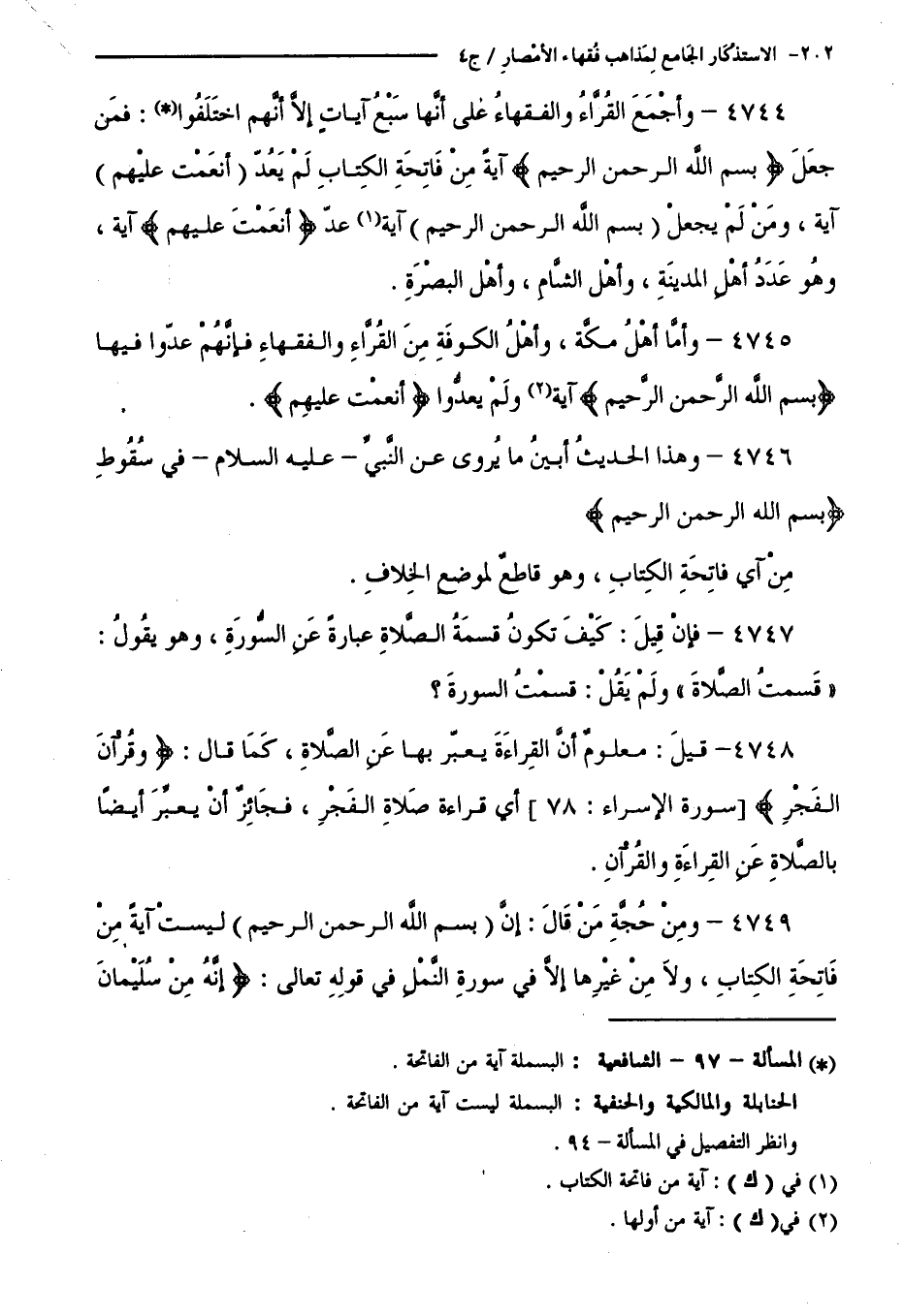 4745 - وَأَمَّا أَهْلُ مَكَّةَ وَأَهْلُ الْكُوفَةِ مِنَ الْقُرَّاءِ وَالْفُقَهَاءِ - فَإِنَّهُمْ عَدُّوا فِيهَا " بِسْمِ اللَّهِ الرَّحْمَنِ الرَّحِيمِ " آيَةً، وَلَمْ يَعُدُّوا " أَنْعَمْتَ عَلَيْهِمْ ".
