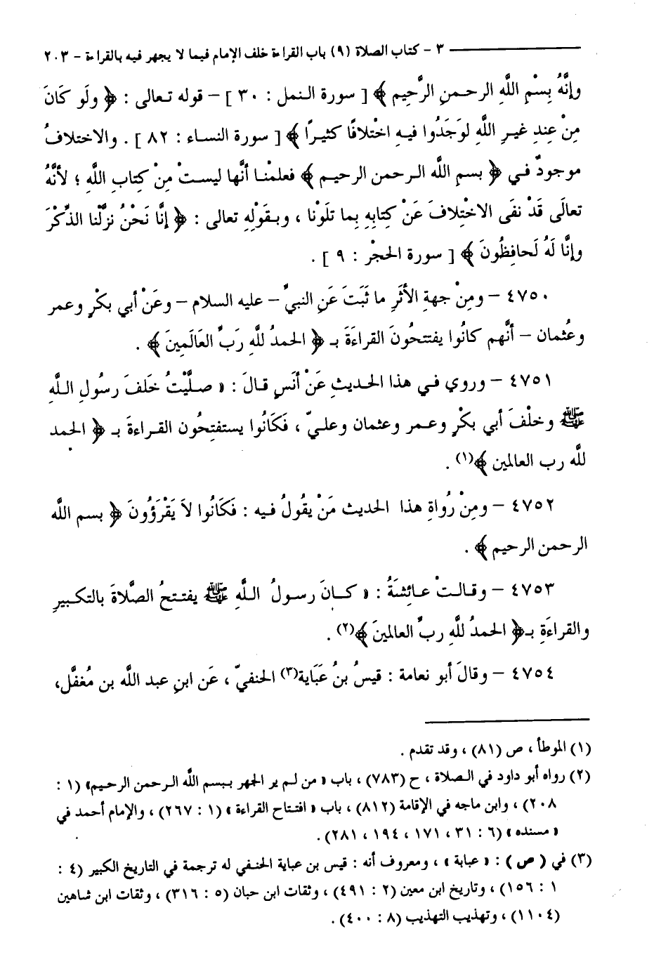 4750 - وَمِنْ جِهَةِ الْأَثَرِ مَا ثَبَتَ عَنِ النَّبِيِّ - عَلَيْهِ السَّلَامُ -، وَعَنْ أَبِي بَكْرٍ، وَعُمَرَ، وَعُثْمَانَ - أَنَّهُمْ كَانُوا يَفْتَتِحُونَ الْقِرَاءَةَ بِ " الْحَمْدُ لِلَّهِ رَبِّ الْعَالَمِينَ ".